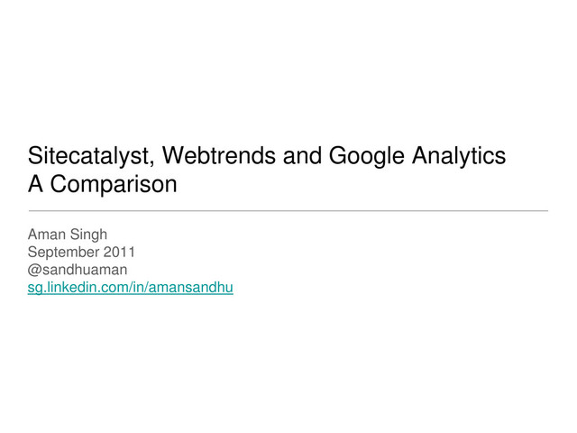 tiered pricing structure based on server calls per month. Fees are as follows: * Small-traffic site —start at about $5,000 per year. Medium-traffic site — $50,000 and $120,000. A larger site starting at approximately $125,000, depending on the amount of traffic and reporting needs. • On premise Costs different • Consulting Costs additional • 3rd largest customer base after Omniture and Coremetrics with 7,000+ customer base • Webtrendsv10 including social integration and a new way to present data • Free • Cost of Implementation and Maintenance via partners • Google Owned, steady addition of features including custom variables, multichannel attribution, Custom Dashboard, Event based Funnels • The SiteCatalyst product is priced on a subscription basis, with a tiered pricing structure based on Web server calls. • Small-traffic site — $5,000 to $10,000, list, per year. Medium-traffic site — $120,000 to $240,000, list, per year.Large-traffic site — $240,000 and higher, list, per year. • Omniture Consulting Services Extra • Discover/Searchcenter at additional cost • Adobe Acquired –changes include integration with day Software(Cq5) ,Social Analytics, Searchcenter revamp and Sitecatalyst v15 architecture update 7 5 8