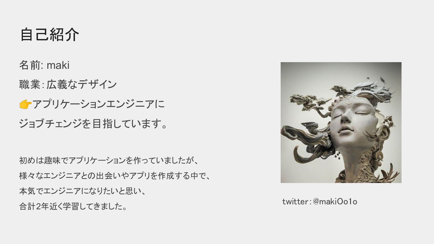 自己紹介 名前: maki 職業:広義なデザイン 👉アプリケーションエンジニアに ジョブチェンジを目指しています。 初めは趣味でアプリケーションを作っていましたが、 様々なエンジニアとの出会いやアプリを作成する中で、 本気でエンジニアになりたいと思い、 合計2年近く学習してきました。