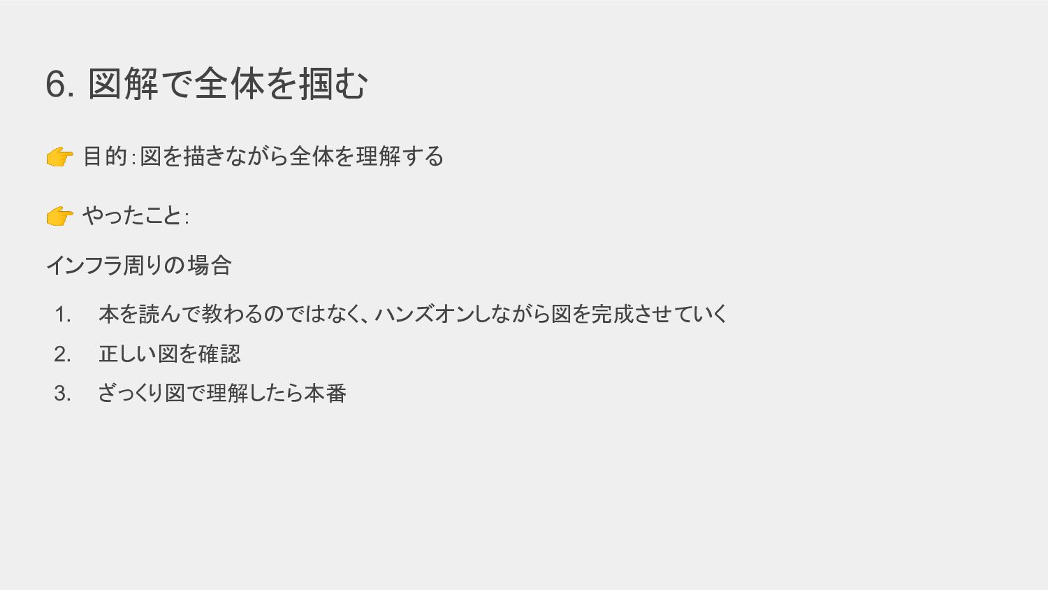 6. 図解で全体を掴む 👉 目的:図を描きながら全体を理解する 👉 やったこと: インフラ周りの場合 1. 本を読んで教わるのではなく、ハンズオンしながら図を完成させていく 2.