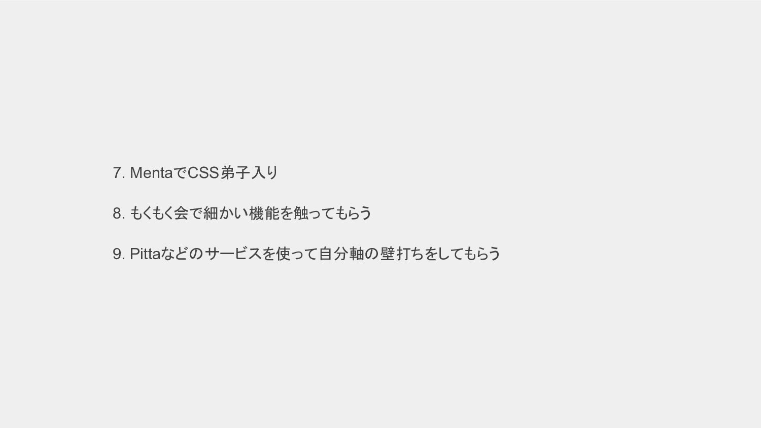 7. MentaでCSS弟子入り 8. もくもく会で細かい機能を触ってもらう 9. Pittaなどのサービスを使って自分軸の壁打ちをしてもらう
