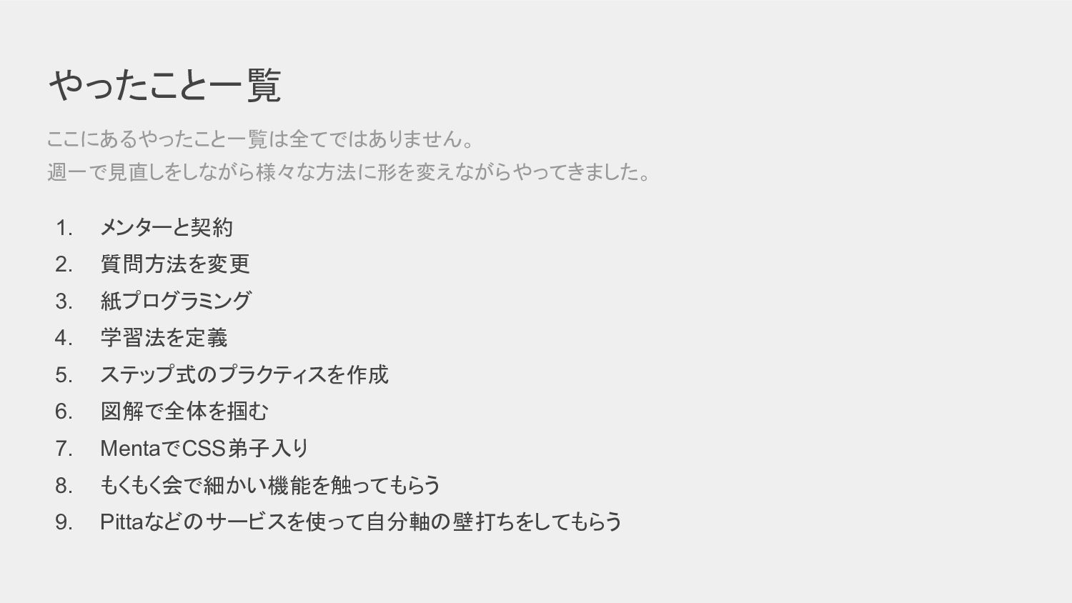 学習法を定義 5. ステップ式のプラクティスを作成 6. 図解で全体を掴む 7. MentaでCSS弟子入り 8. もくもく会で細かい機能を触ってもらう 9. Pittaなどのサービスを使って自分軸の壁打ちをしてもらう