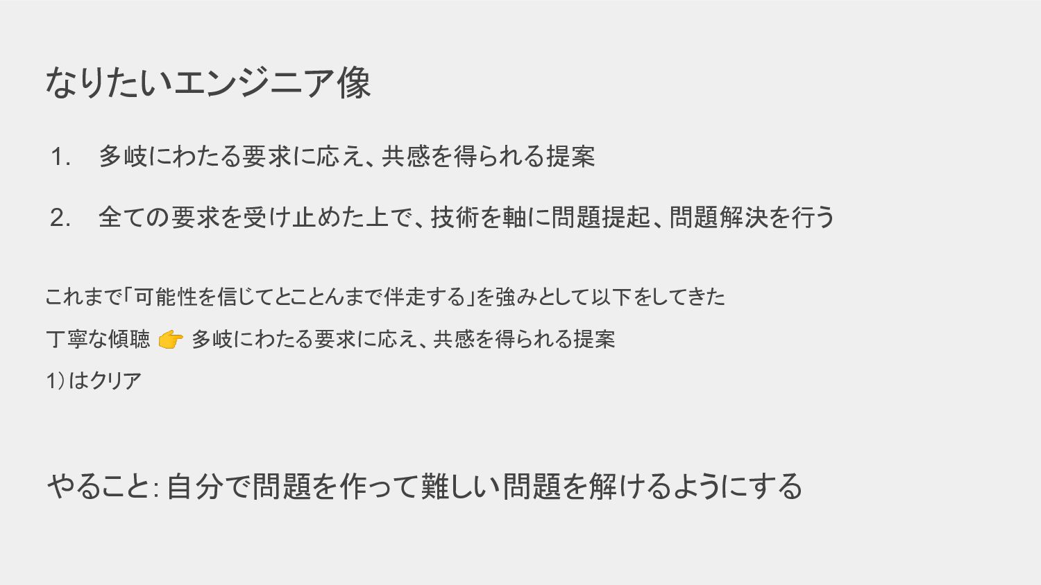 なりたいエンジニア像 1. 多岐にわたる要求に応え、共感を得られる提案 2. 全ての要求を受け止めた上で、技術を軸に問題提起、問題解決を行う これまで「可能性を信じてとことんまで伴走する」を強みとして以下をしてきた 丁寧な傾聴 👉 多岐にわたる要求に応え、共感を得られる提案 1)はクリア