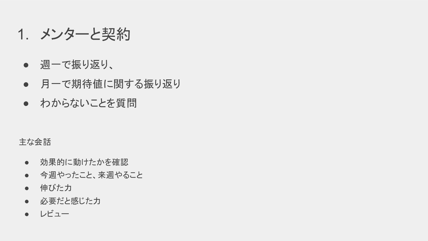 1. メンターと契約 • 週一で振り返り、 • 月一で期待値に関する振り返り • わからないことを質問 主な会話 •