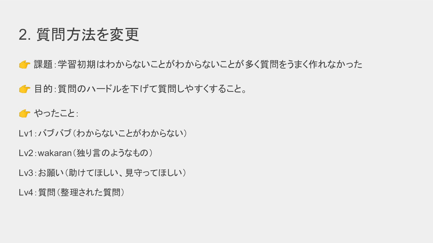 2. 質問方法を変更 👉 課題:学習初期はわからないことがわからないことが多く質問をうまく作れなかった 👉 目的:質問のハードルを下げて質問しやすくすること。 👉 やったこと: Lv1:バブバブ(わからないことがわからない) Lv2:wakaran(独り言のようなもの)