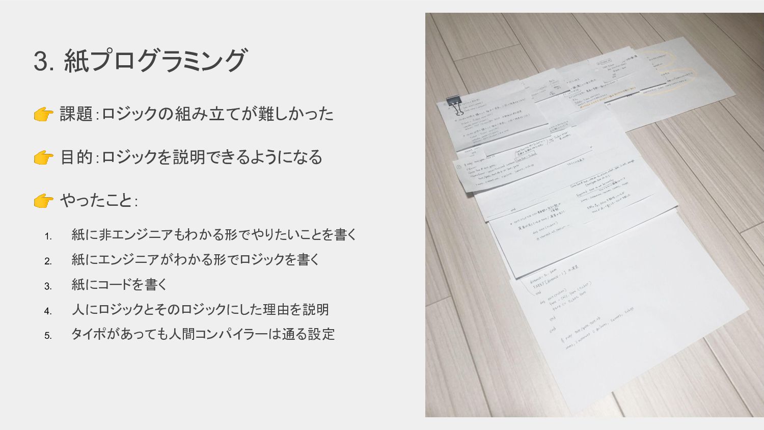 3. 紙プログラミング 👉 課題:ロジックの組み立てが難しかった 👉 目的:ロジックを説明できるようになる 👉 やったこと: 1. 紙に非エンジニアもわかる形でやりたいことを書く