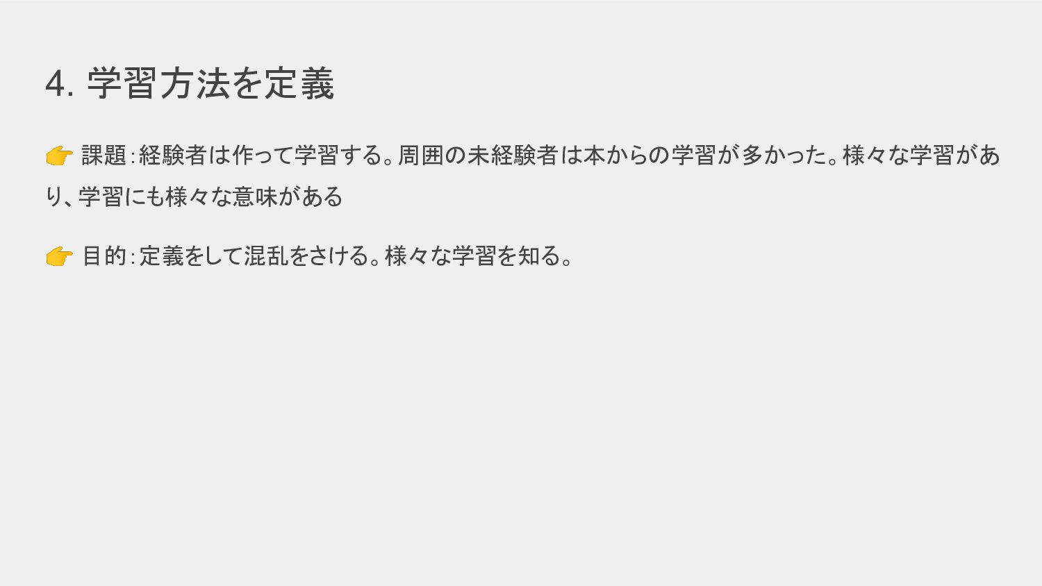 4. 学習方法を定義 👉 課題:経験者は作って学習する。周囲の未経験者は本からの学習が多かった。様々な学習があ り、学習にも様々な意味がある 👉 目的:定義をして混乱をさける。様々な学習を知る。