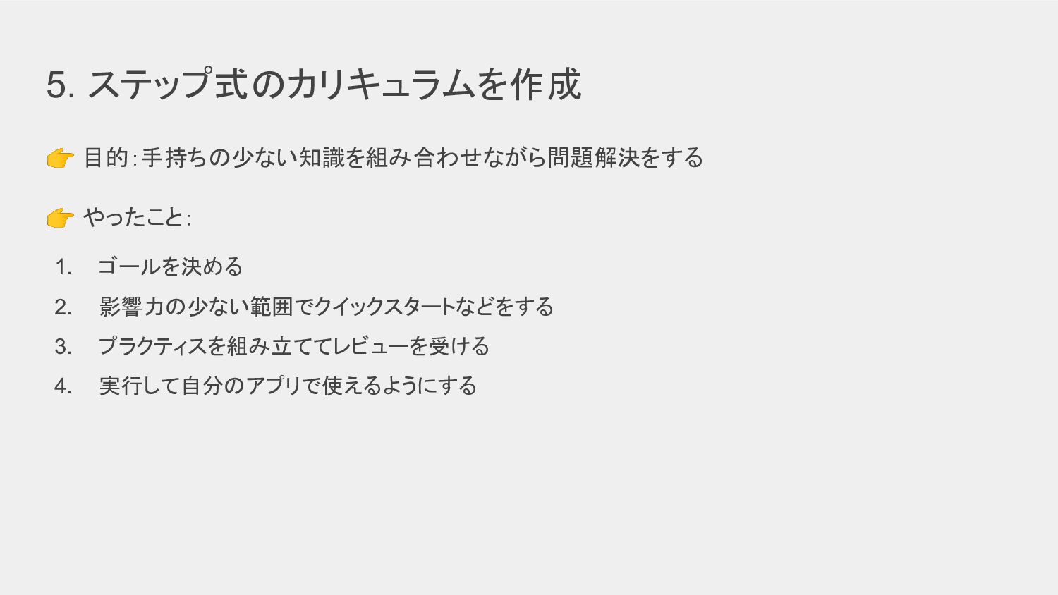 5. ステップ式のカリキュラムを作成 👉 目的:手持ちの少ない知識を組み合わせながら問題解決をする 👉 やったこと: 1. ゴールを決める 2. 影響力の少ない範囲でクイックスタートなどをする