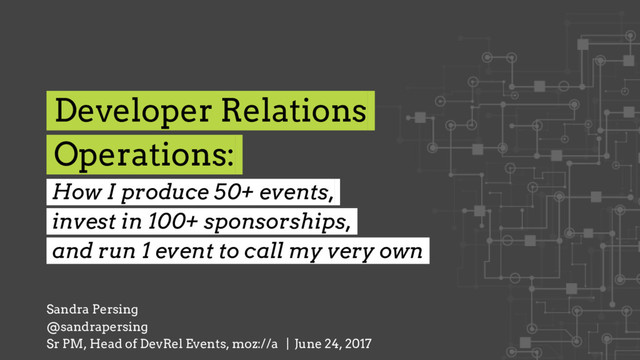 For the past years at Mozilla, and beyond, creating effective DevRel engagement programs have been the result of merging tactical investment strategy with operational excellence. Sandra Persing, Senior Program Manager for Developer Relations, will tell her "DevRelOps" story at #WeRiseTech of how sponsorship, events, and lessons learned from her volunteer leadership roles helps her excel at her career.