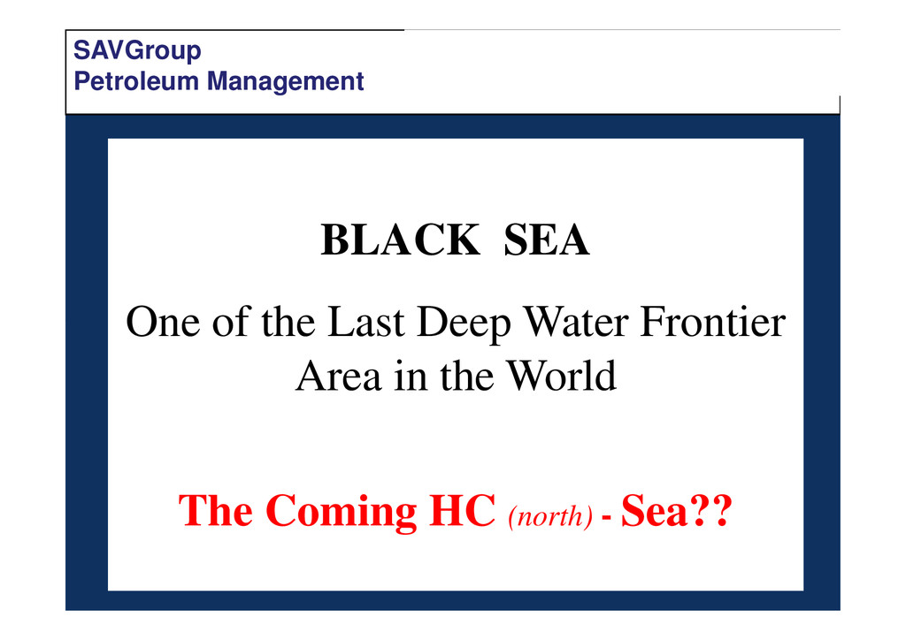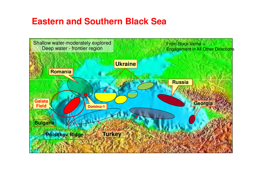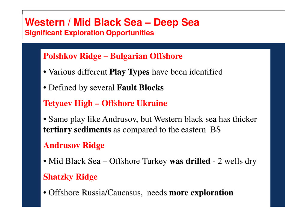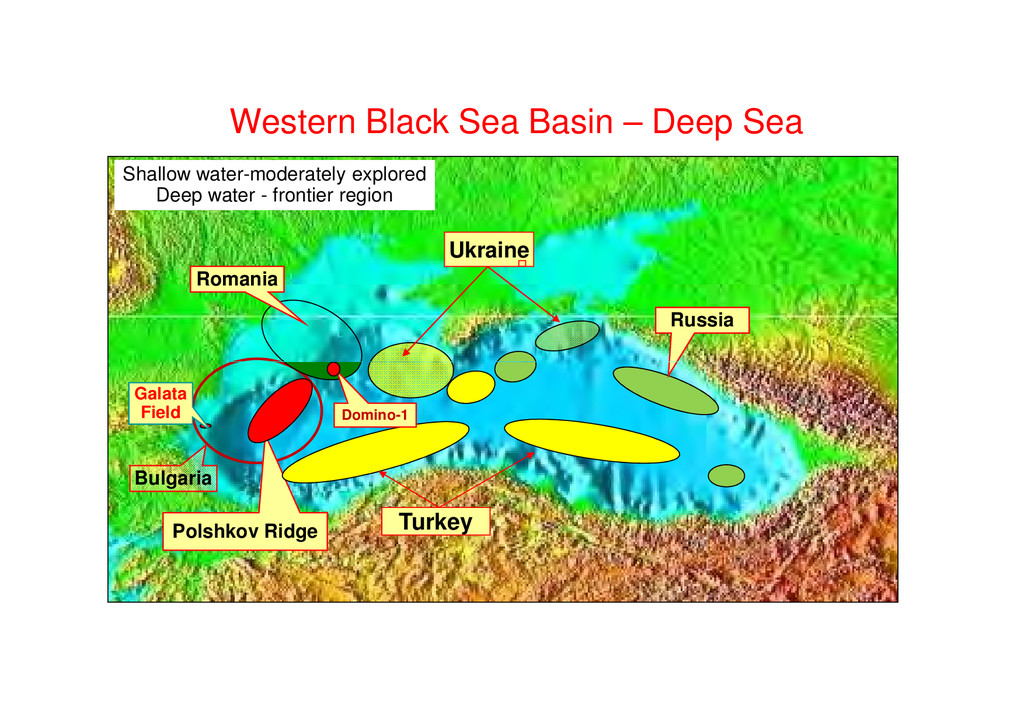 Tremendous Exploration Potential, Many Undrilled Structures – Stovba et.al. Describe Deep Water Plays with Huge Potential for HC - Naudts et al., Prospectivity of the Dnepr Paleodelta Shatzky Ridge, Offshore Russia: Large Structure, Seen by Shatzky Ridge, Offshore Russia: Large Structure, Seen by Meisner et.al and Edwards et al. •Turkish Black Sea: Numerous Exploration Targets Described by Menliki et al. Western Black Sea: Tari et al. describes Polshkov Ridge High Potential (see above), Bega and Ionescu Outline Romanian play types leading to Domino-1 Discovery, Duley and Fogg Promote Technical Success to Romanian Black Sea