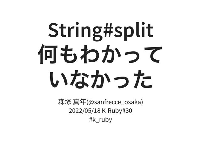 String#split 何もわかって いなかった 森塚 真年(@sanfrecce_osaka) 2022/05/18 K-Ruby#30 #k_ruby