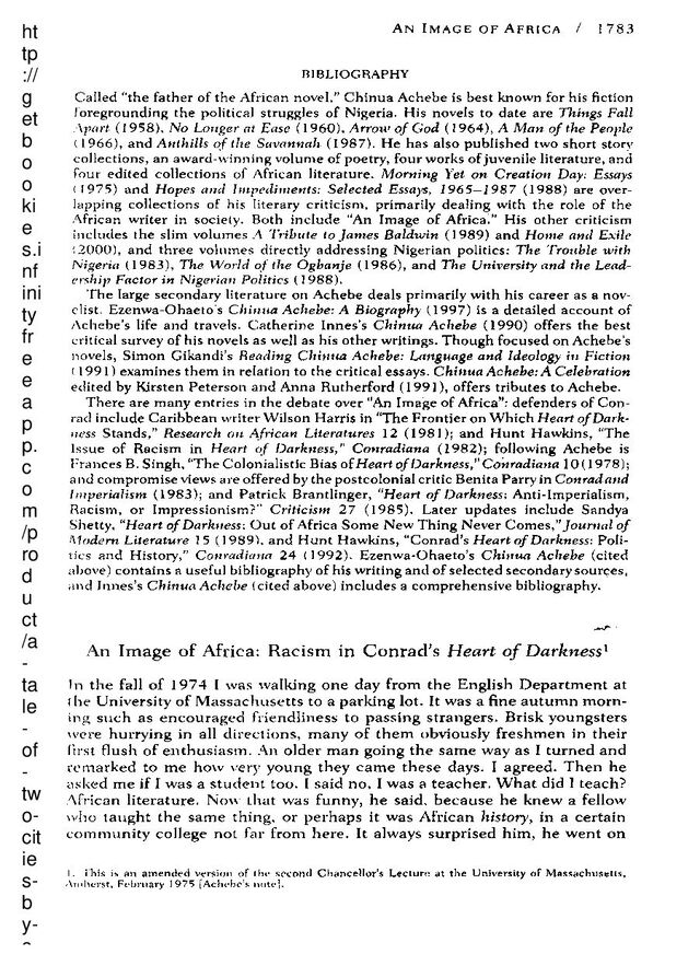 band. For as it happened, soon after Conrad had written his book an event of far greater consequence was taking place in the art world of Europe. This is how Frank WiIlett, a British art historian, describes it: Gauguir'l had gone to Tahiti, the most extravagant individual act of turn- ing to a non-European culture in the decades immediately, before and after 1900, when European artists wer~ avid for new artistic experiences', but it was only about 1904-5 that Mrican art began to make its distinc- tive impact. 'One piece is still identifiable; it isa mask that had been given to Maurice Vlaminck in 19.Q5,;' He records that, Derain Was "speechless" and "stunned" when hi? saw it, bought it from Vlaminck and in turn showed it to Picasso and Matisse, wh.o were also greatly affected by it. Ambroise Vollard then borrowed it'and had it cast in bronze ... The revolution of twentieth century art was under way!S The mask in question wa~ ,made by oth~r sav",ges living just no~t~ Qf Con- tadis Rivet Corigo. 'they have' a name too: the Fang people, and are without a doubt among the 'world'sgteatestrnasters of the sculptured form. The event Frank Willett is referring 'to marked the beginning of cubism and the infusion of new life ,into Eur6pean art that' had' run completely out of strength: ' , , ,The point of all this is to suggest that Conrad's p~cture of the peopltis of the' Congo seems, grossly inadequate eveh at the heiglit: of ~heirsubjection 'to the ravages of King t..eopold's Inl:ernatfomil AssodaHoh forthe Civilization of Central Mrica.9 ' . . . . " ,,,' Travellers with closed minds can tell us'lit'tle'eXcept about i:hetnsehres.'BUt even those not blinkered, like Gonrad, with.xenophob~a, can be'astoilishh\g1y blind. Let me' digress a littleh~re. One of tIle greateshind inostiritr~pld travdlEirs of all time, Marco Polo, Journeyed to the Fa'r East from the Me~~ iterranean in the thirteenth centtirY'iindsperit twenty years''iri the court of Kubh:ii'Khan'iri China. c>nhis retUrn to Venice heset-d6Wrlin his book entitled Description df the World his impressions of the peoples and' places and customs he had seen. But there were at least twci extraordinary omissions in his account. He said nothingabbut the art of prirtting,itnki},dwn as yet In Europe hut in full flower in Chitaa. He either did nrit notice it at all or, if he did, failed to see what use Europe could possiblyhave'for)t~Whatever the reason, Europe had to wait another hundred years fdr'Gutehberg:i But even more spectacular was MaJ;coPolo's omission of 'ariy refer~nce to the Great Wall of China, nearly four thousand miles lOng and already more than one thousand yearl old at the time of hi, vi.it. Aaatn, he may not have .een It; but the Great Wall of China, ii"the only Itructure built by man which il visible from the ritoonllndeed, travellers can be blind. As I said earlier Conrad did not originate the image of Mrica which we ", ! 8, Frank Willett, African Art, (New York: Praeger, 1971), pp.35-36 [Achebe's notel. Willett' (b. 1925), English art historian Who focused on works, from Africa. WilIett names the important French modern painters Paul Gauguln (1848-1903), Mliurice'de Vlaltilflck (1876~1958), And~ Derlan (1880-1954), and Heilfi Matisse (1869-1954), as well as the great Sr.anish modernist Pablo'Plcilsso (1881-1973). Vol ard (1867-1939) was an Influ- ential French art dealer and publisher who sup- ported modern art. 9. An International group of explorers, geogra- phers, and scientists, founded by Leopold It; it was first convened In Brunels In 1876. I. Great Mongol ruler and emperor of China (1216-1294). Polo (1254-1324), Venetlan mer- chant ',,,id travel;,r who Is said to have spent years In the Khan's service'; his Writings about the court and Asia maile him' famous_ 2, Johannes Gutenberg (ca. 1397-1468), the German printer credited with inventing movable type, which revolutionized book production_