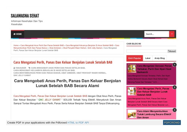 Lunak Setelah BAB Sedang Mengalami Perih, Panas & Keluar Benjolan Setelah BAB ?? Namun, Anda Bingung Apa Sebenarnya Kondisi Ini ?? Simak Pejelesannya Berikut ! Rasa perih, panas serta keluarnya benjolan lunak kecil pada lubang anus ketika setelah buang air besar (BAB) ini bisa menjadi salah satu pertanda atau gejala dari suatu penyakit tertentu, ada banyak kondisi kesehatan dengan memiliki gejala-gejala seperti ini, namun walaupun demikian biasanya penyakit yang paling umum sering terjadi dengan gejala seperti ini adalah ambeien atau wasir. QnC Jelly Gamat about 2 months ago Video Unavailable Video Unavailable Sorry, this video could not be Sorry, this video could not be played. played. Learn More Learn More QnC Jelly Gamat 1,561 likes Like Page Share taniauser Lihat profil lengkapku MENGENAI SAYA Create PDF in your applications with the Pdfcrowd HTML to PDF API PDFCROWD