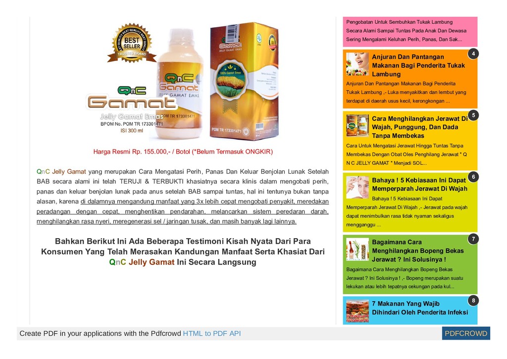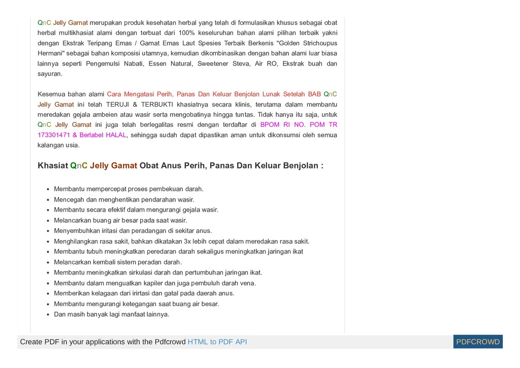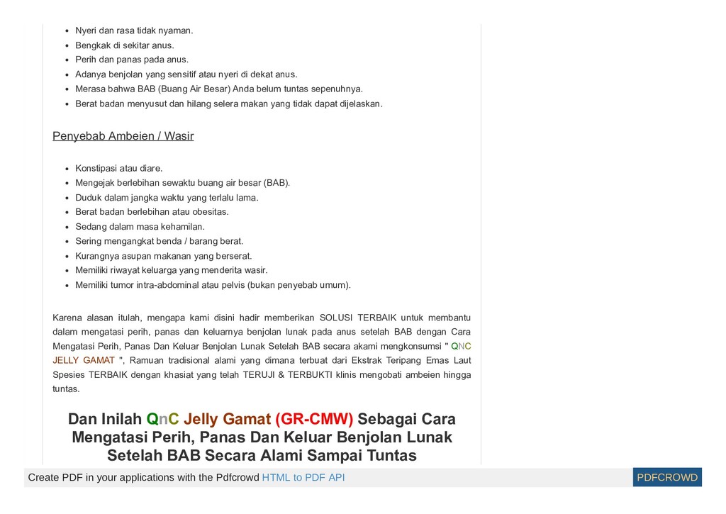 dan panas pada anus. Adanya benjolan yang sensitif atau nyeri di dekat anus. Merasa bahwa BAB (Buang Air Besar) Anda belum tuntas sepenuhnya. Berat badan menyusut dan hilang selera makan yang tidak dapat dijelaskan. Penyebab Ambeien / Wasir Konstipasi atau diare. Mengejak berlebihan sewaktu buang air besar (BAB). Duduk dalam jangka waktu yang terlalu lama. Berat badan berlebihan atau obesitas. Sedang dalam masa kehamilan. Sering mengangkat benda / barang berat. Kurangnya asupan makanan yang berserat. Memiliki riwayat keluarga yang menderita wasir. Memiliki tumor intra-abdominal atau pelvis (bukan penyebab umum). Karena alasan itulah, mengapa kami disini hadir memberikan SOLUSI TERBAIK untuk membantu dalam mengatasi perih, panas dan keluarnya benjolan lunak pada anus setelah BAB dengan Cara Mengatasi Perih, Panas Dan Keluar Benjolan Lunak Setelah BAB secara akami mengkonsumsi " QNC JELLY GAMAT ", Ramuan tradisional alami yang dimana terbuat dari Ekstrak Teripang Emas Laut Spesies TERBAIK dengan khasiat yang telah TERUJI & TERBUKTI klinis mengobati ambeien hingga tuntas. Dan Inilah QnC Jelly Gamat (GR-CMW) Sebagai Cara Mengatasi Perih, Panas Dan Keluar Benjolan Lunak Setelah BAB Secara Alami Sampai Tuntas Create PDF in your applications with the Pdfcrowd HTML to PDF API PDFCROWD