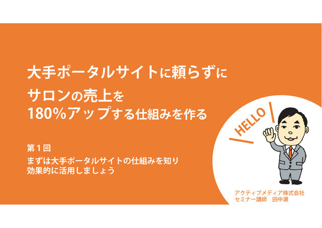 大手ポータルサイトに頼らずに サロンの売上を 180%アップする仕組みを作る 第1回 まずは大手ポータルサイトの仕組みを知り 効果的に活用しましょう アクティブメディア株式会社 セミナー講師 田中潮