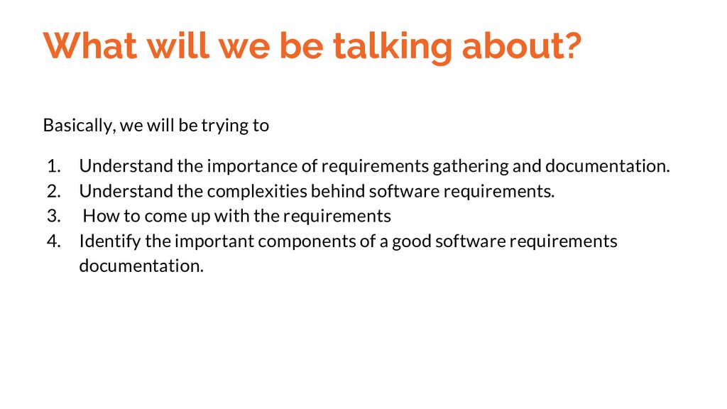 trying to 1. Understand the importance of requirements gathering and documentation. 2. Understand the complexities behind software requirements. 3. How to come up with the requirements 4. Identify the important components of a good software requirements documentation.