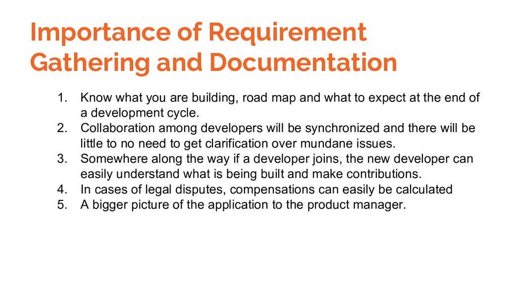 are building, road map and what to expect at the end of a development cycle. 2. Collaboration among developers will be synchronized and there will be little to no need to get clarification over mundane issues. 3. Somewhere along the way if a developer joins, the new developer can easily understand what is being built and make contributions. 4. In cases of legal disputes, compensations can easily be calculated 5. A bigger picture of the application to the product manager.