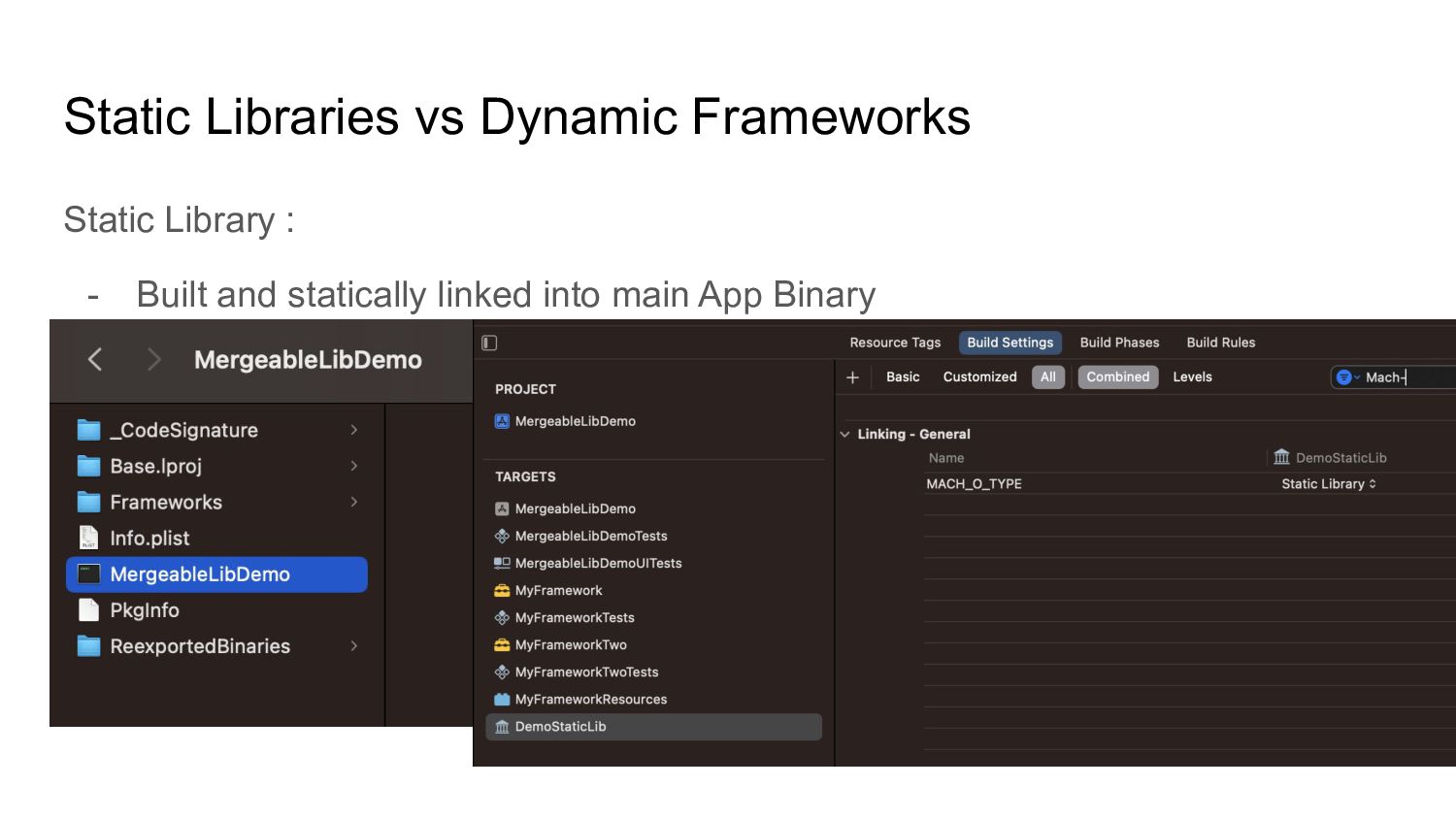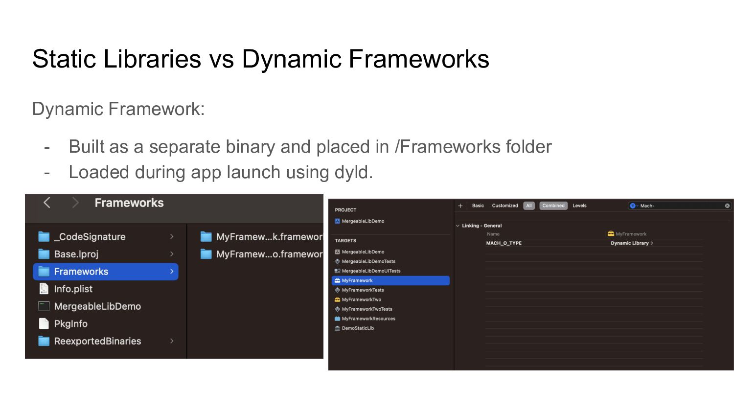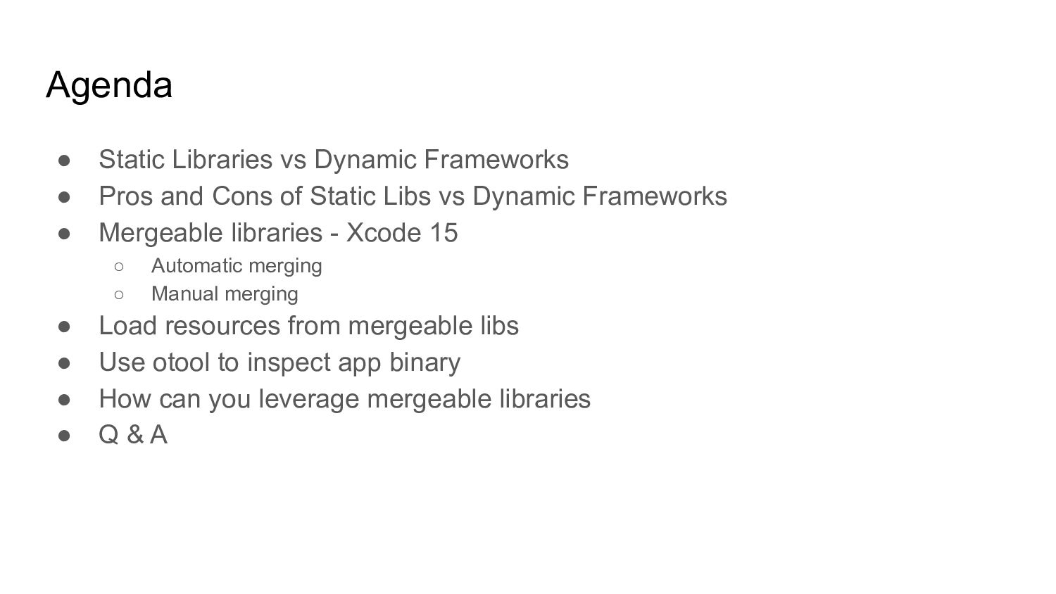 Cons of Static Libs vs Dynamic Frameworks • Mergeable libraries - Xcode 15 ◦ Automatic merging ◦ Manual merging • Load resources from mergeable libs • Use otool to inspect app binary • How can you leverage mergeable libraries • Q & A