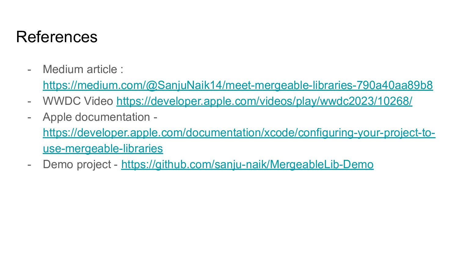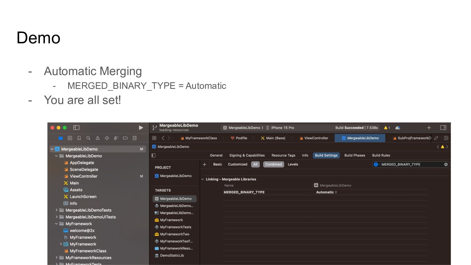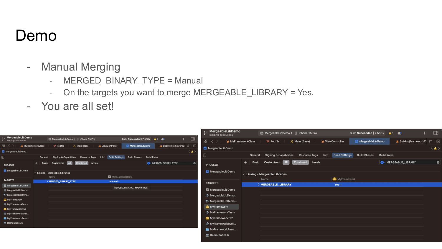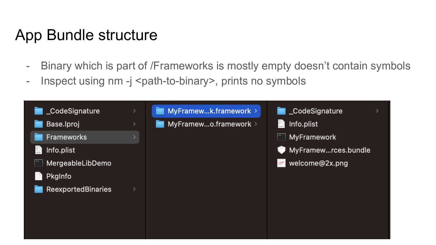 Cons of Static Libs vs Dynamic Frameworks • Mergeable libraries - Xcode 15 ◦ Automatic merging ◦ Manual merging • Load resources from mergeable libs • Use otool to inspect app binary • How can you leverage mergeable libraries • Q & A