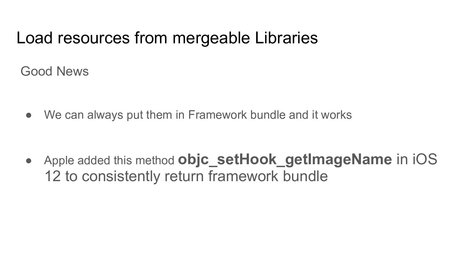 resources in framework bundle - For static libs we create a resource bundle - Mergeable libraries behaves as dynamic framework during development and static lib during release Where to put resources?