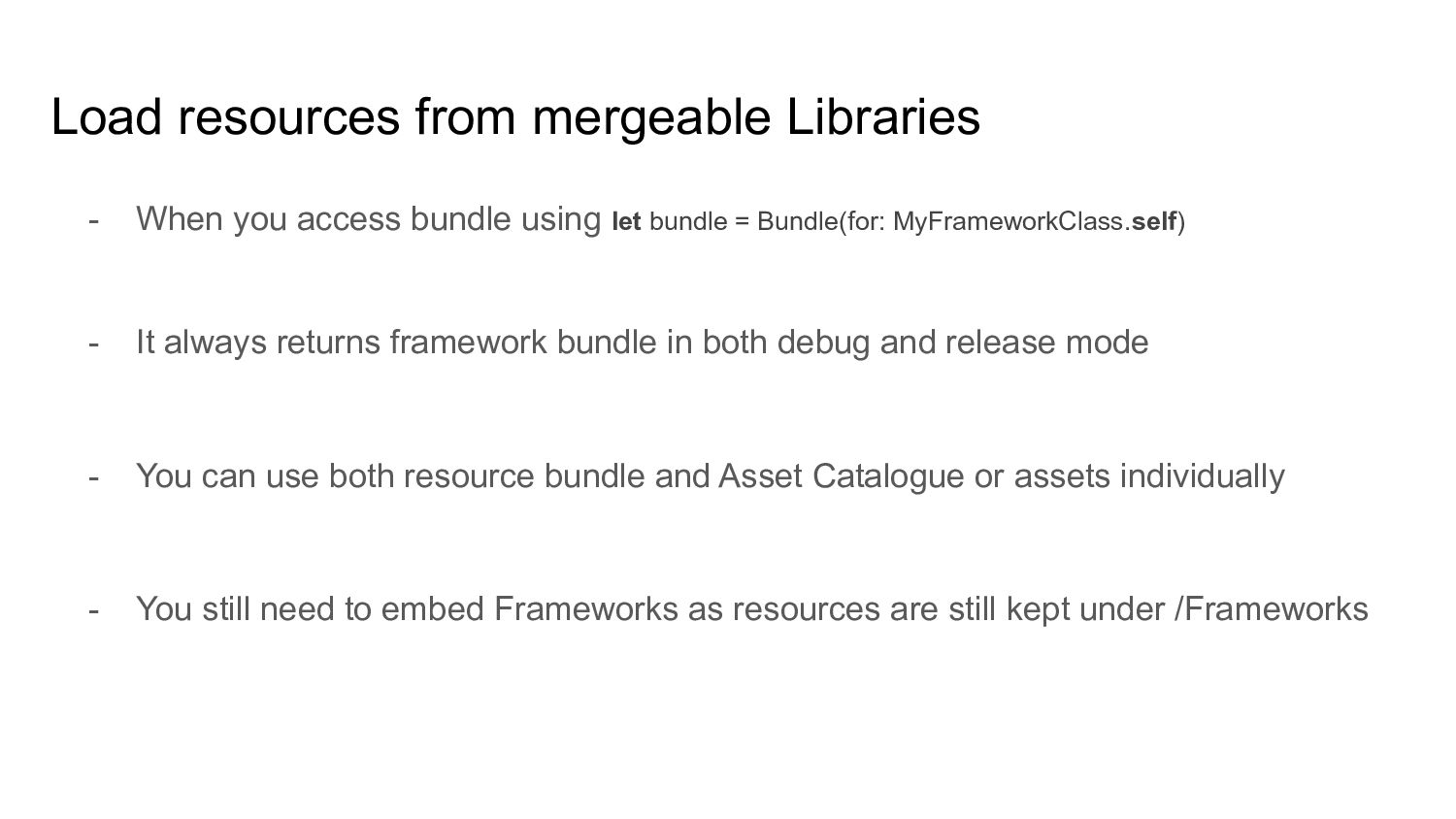 using let bundle = Bundle(for: MyFrameworkClass.self) - It always returns framework bundle in both debug and release mode - You can use both resource bundle and Asset Catalogue or assets individually - You still need to embed Frameworks as resources are still kept under /Frameworks
