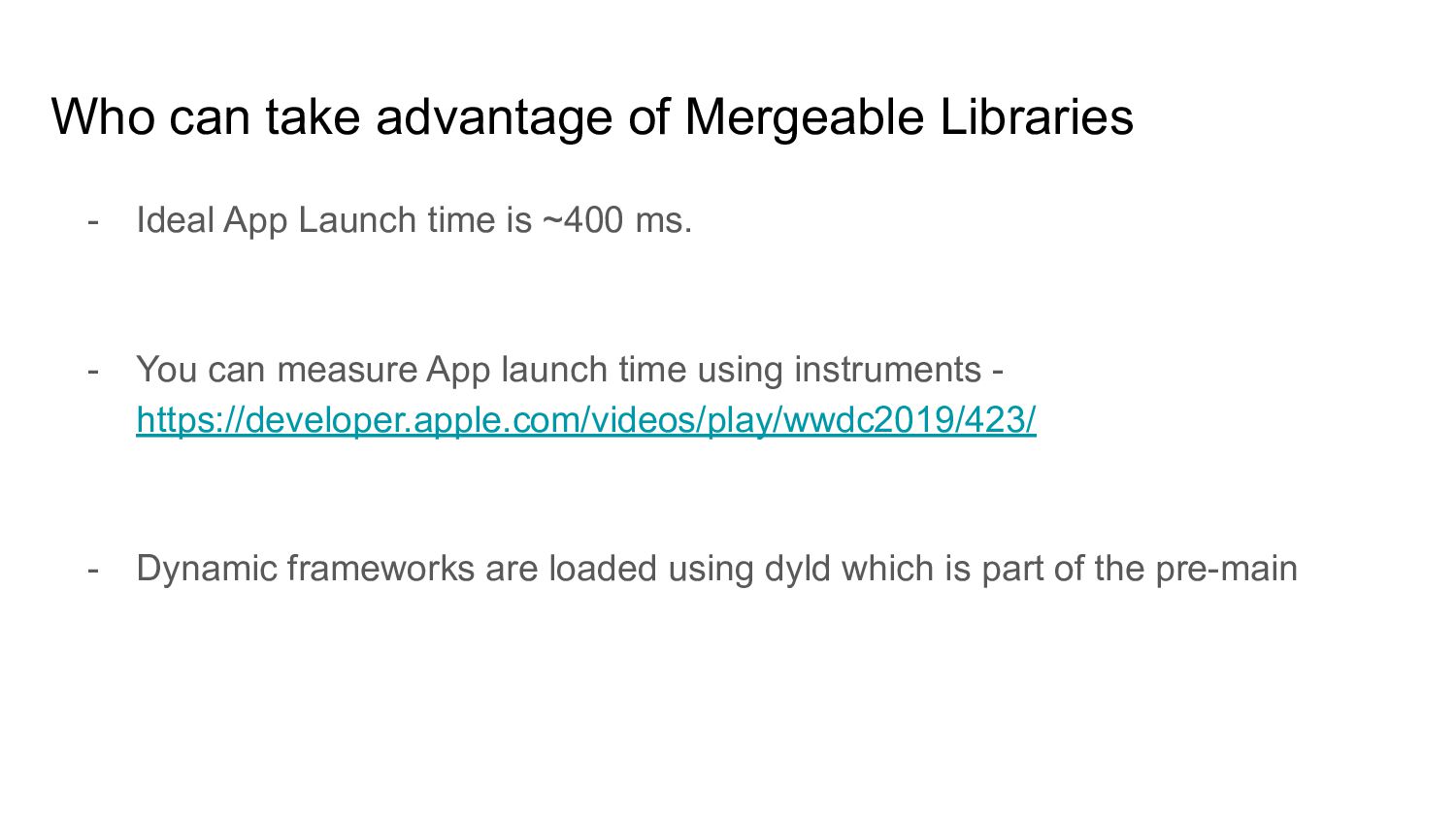Launch time is ~400 ms. - You can measure App launch time using instruments - https://developer.apple.com/videos/play/wwdc2019/423/ - Dynamic frameworks are loaded using dyld which is part of the pre-main