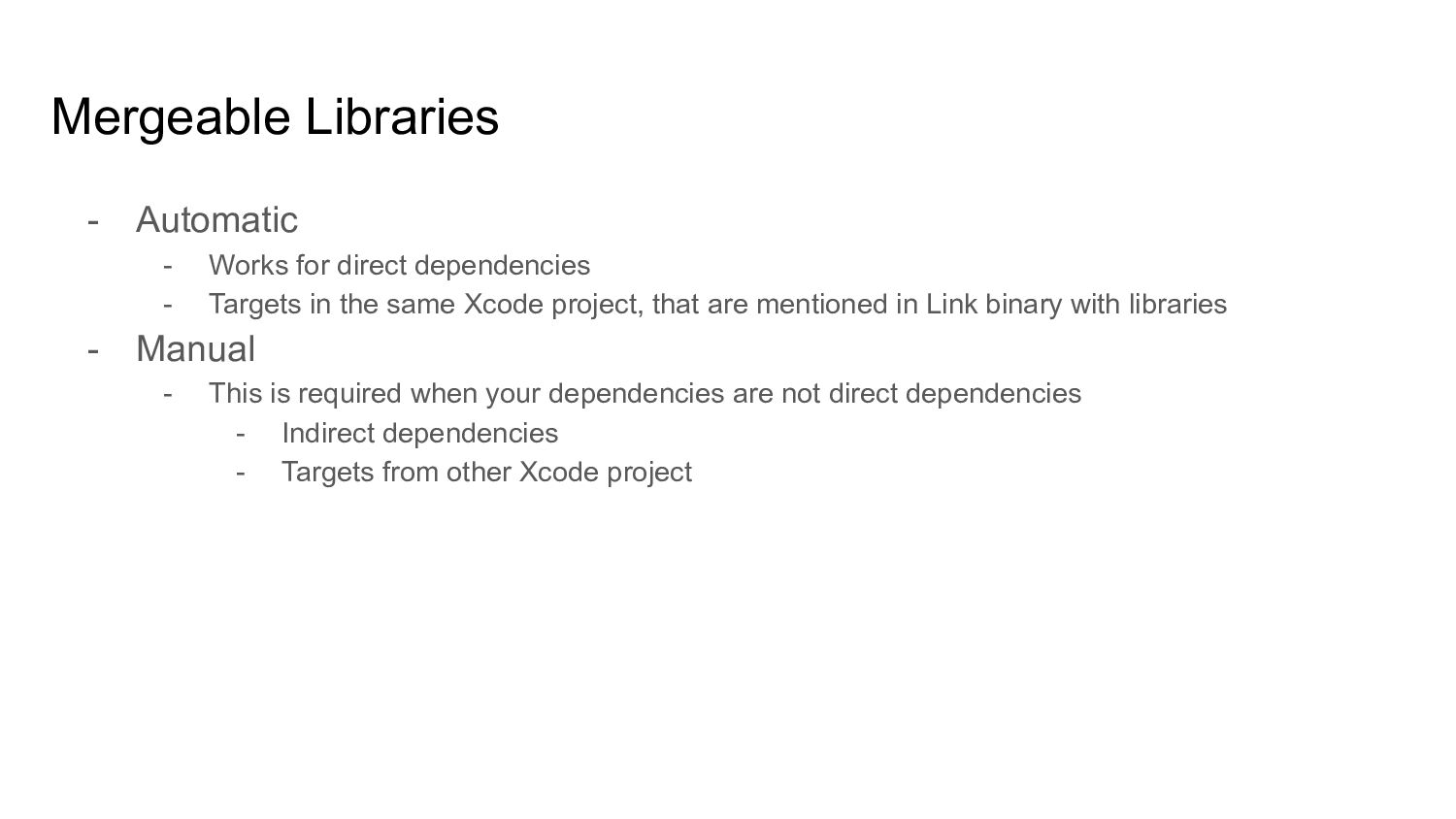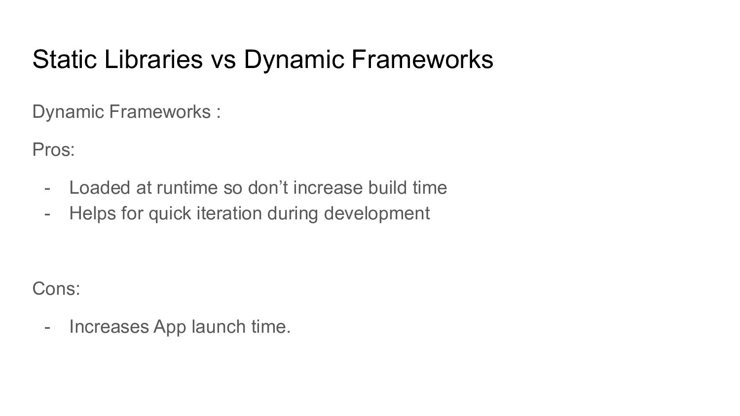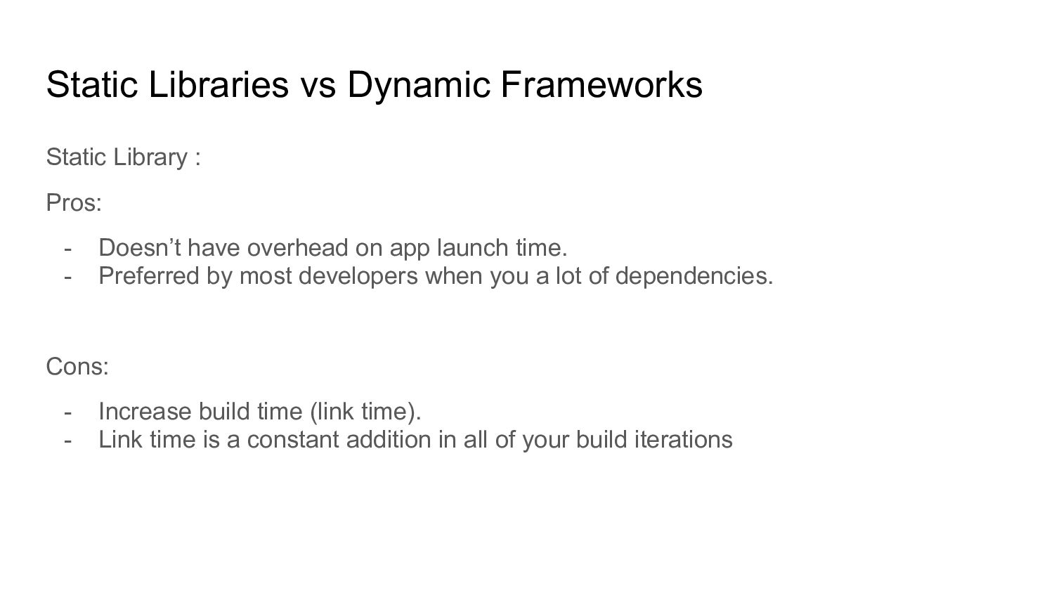 Doesn’t have overhead on app launch time. - Preferred by most developers when you a lot of dependencies. Cons: - Increase build time (link time). - Link time is a constant addition in all of your build iterations