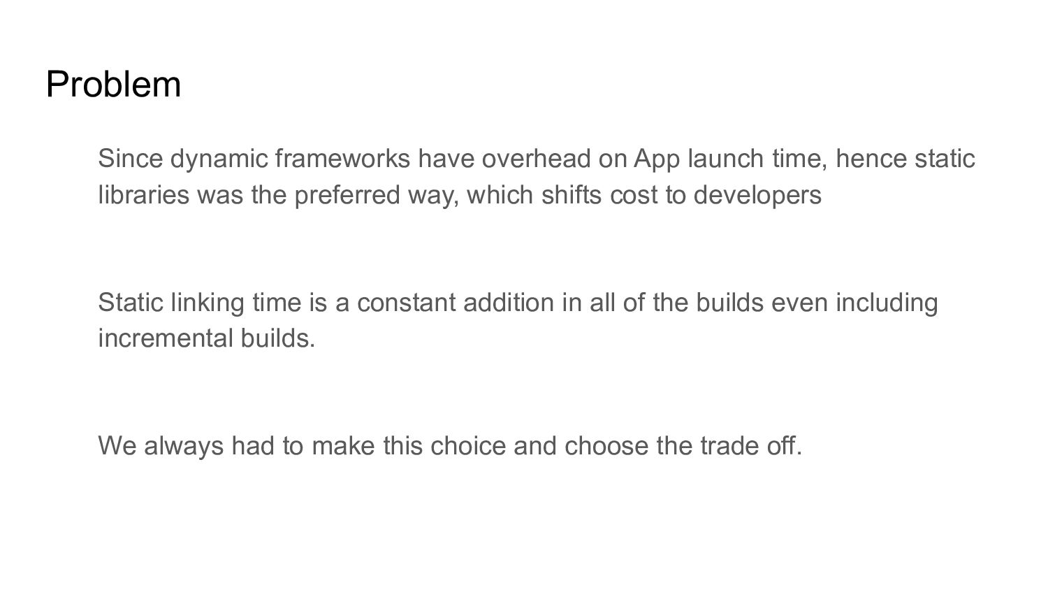 hence static libraries was the preferred way, which shifts cost to developers Static linking time is a constant addition in all of the builds even including incremental builds. We always had to make this choice and choose the trade off.