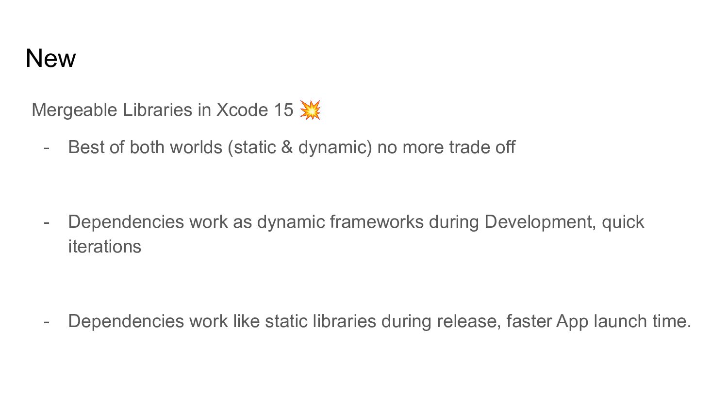 both worlds (static & dynamic) no more trade off - Dependencies work as dynamic frameworks during Development, quick iterations - Dependencies work like static libraries during release, faster App launch time.