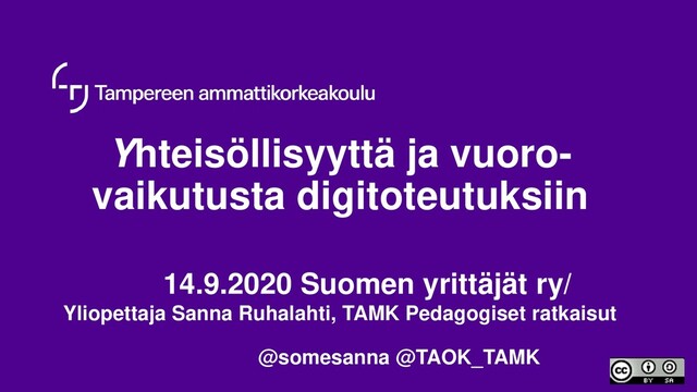ja rakennetaan yhteisössä sekä, että oppiminen on sosiaalinen prosessi (Vygotsky 1978; Lave & Wenger, 1991) • avoimet oppimisympäristöt tarjoavat opiskelijoille uusia mahdollisuuksia sitoutua toimimaan oppimisyhteisöissä sekä oppimaan toisilta ja julkaisemaan tehtäviään (Gibson, 2013) • onnistuneessa yhteisöllisessä oppimisessa ryhmän jäsenet ovat aktiivisesti sitoutuneita oppimisprosessin edistämiseen. Yhteisöllisen työskentelyn kautta syntyy uutta tietoa ja osaamista. (Näykki, Järvenoja, Järvelä & Kirschner, 2015) • yhteisöllinen työskentely vaatii vastavuoroisuutta eli eri osapuolten tietämyksen jakamista toisille sekä sitoutumista tavoitteelliseen ja jaettuun yhteisölliseen oppimiseen (Leinonen, Järvelä & Häkkinen, 2005) • vuorovaikutteisen teknologian nähdään edistävän yhteisöllistä oppimista ja tiedonrakentamista sekä tuovan parempaa sitoutumista (Aarnio & Enqvist, 2016) @somesanna @TAOK_TAMK