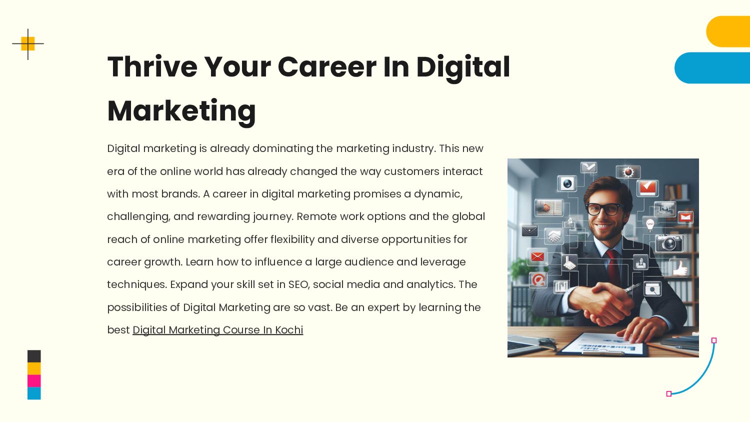 dominating the marketing industry. This new era of the online world has already changed the way customers interact with most brands. A career in digital marketing promises a dynamic, challenging, and rewarding journey. Remote work options and the global reach of online marketing offer flexibility and diverse opportunities for career growth. Learn how to influence a large audience and leverage techniques. Expand your skill set in SEO, social media and analytics. The possibilities of Digital Marketing are so vast. Be an expert by learning the best Digital Marketing Course In Kochi