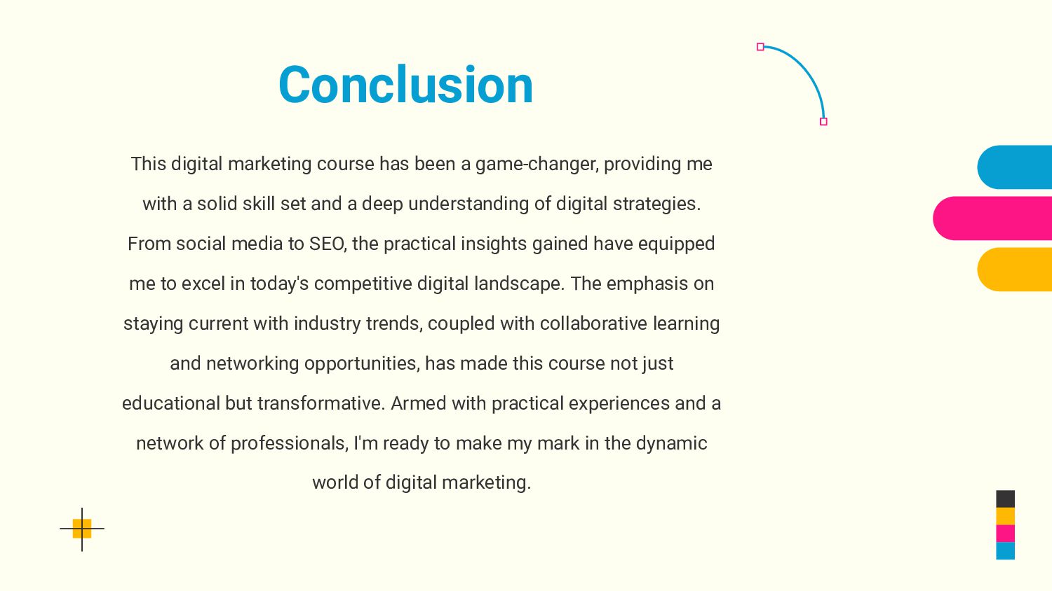 with a solid skill set and a deep understanding of digital strategies. From social media to SEO, the practical insights gained have equipped me to excel in today's competitive digital landscape. The emphasis on staying current with industry trends, coupled with collaborative learning and networking opportunities, has made this course not just educational but transformative. Armed with practical experiences and a network of professionals, I'm ready to make my mark in the dynamic world of digital marketing. Conclusion