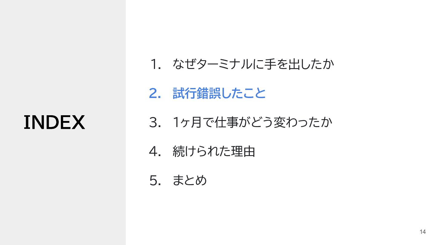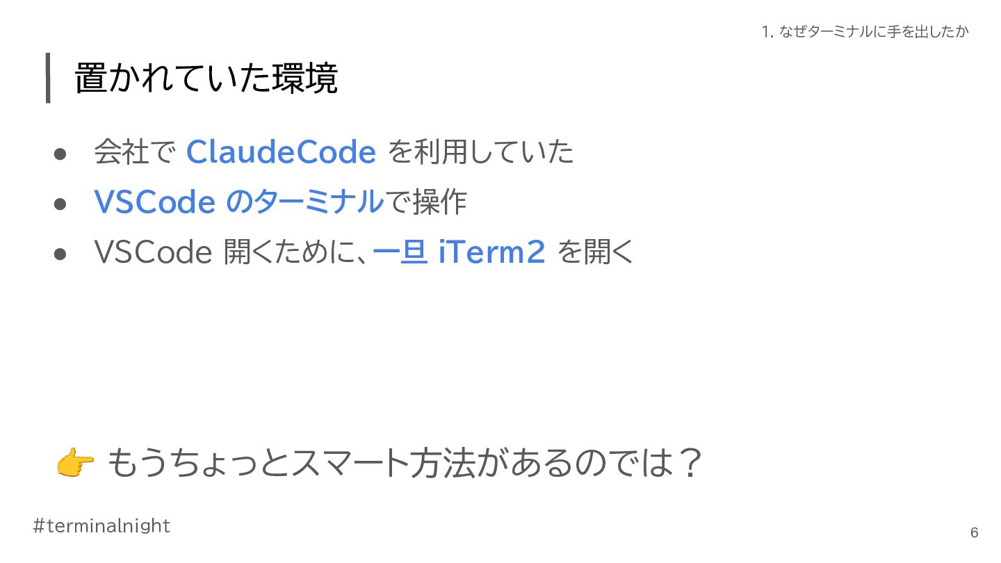 開くために、一旦 iTerm2 を開く 6 1. なぜターミナルに手を出したか 置かれていた環境 👉 もうちょっとスマート方法があるのでは?
