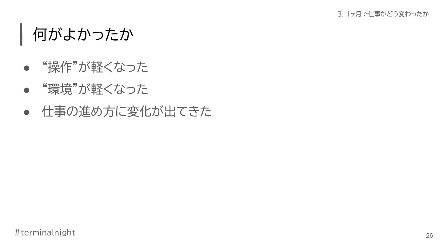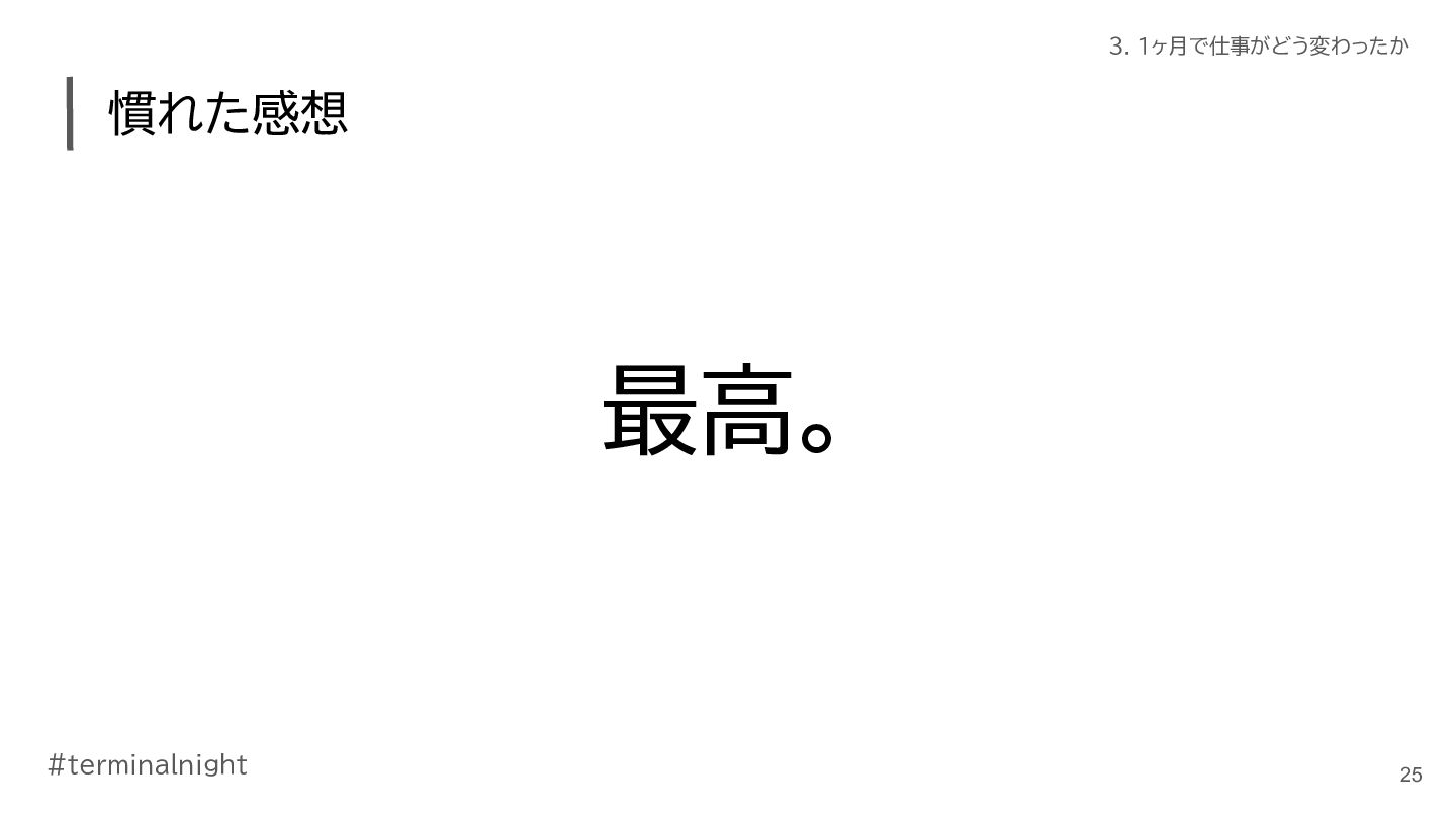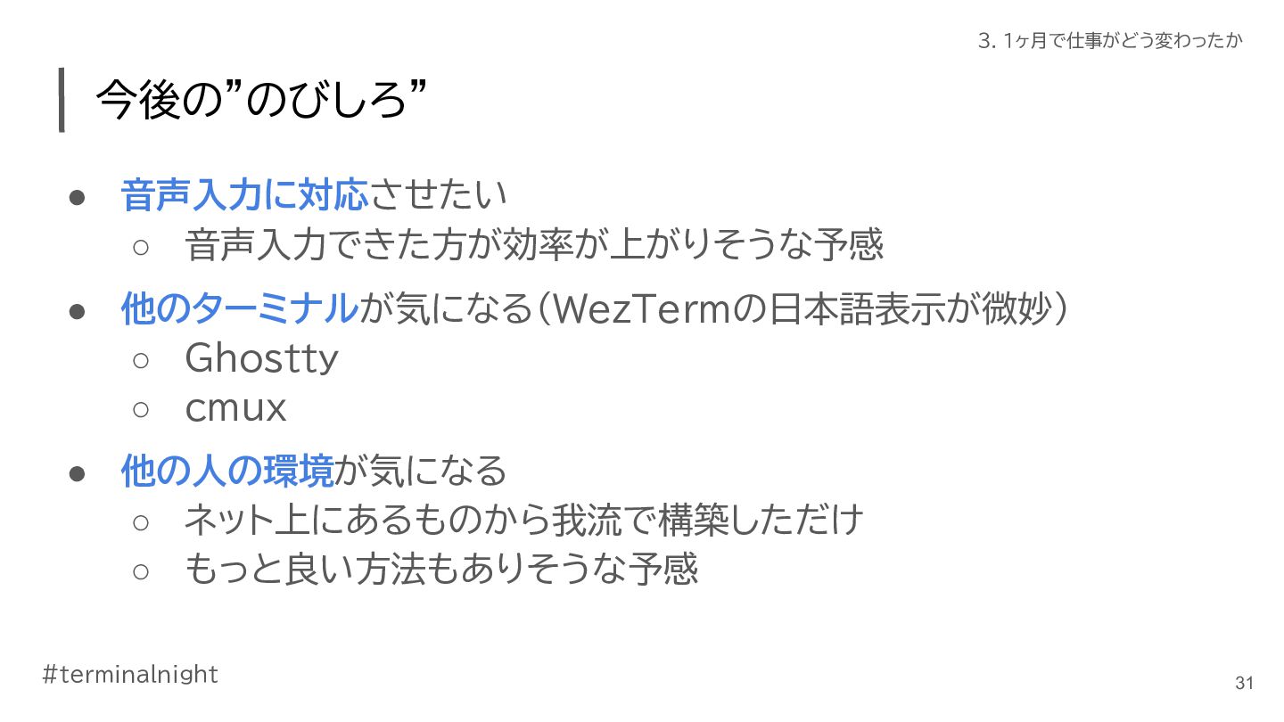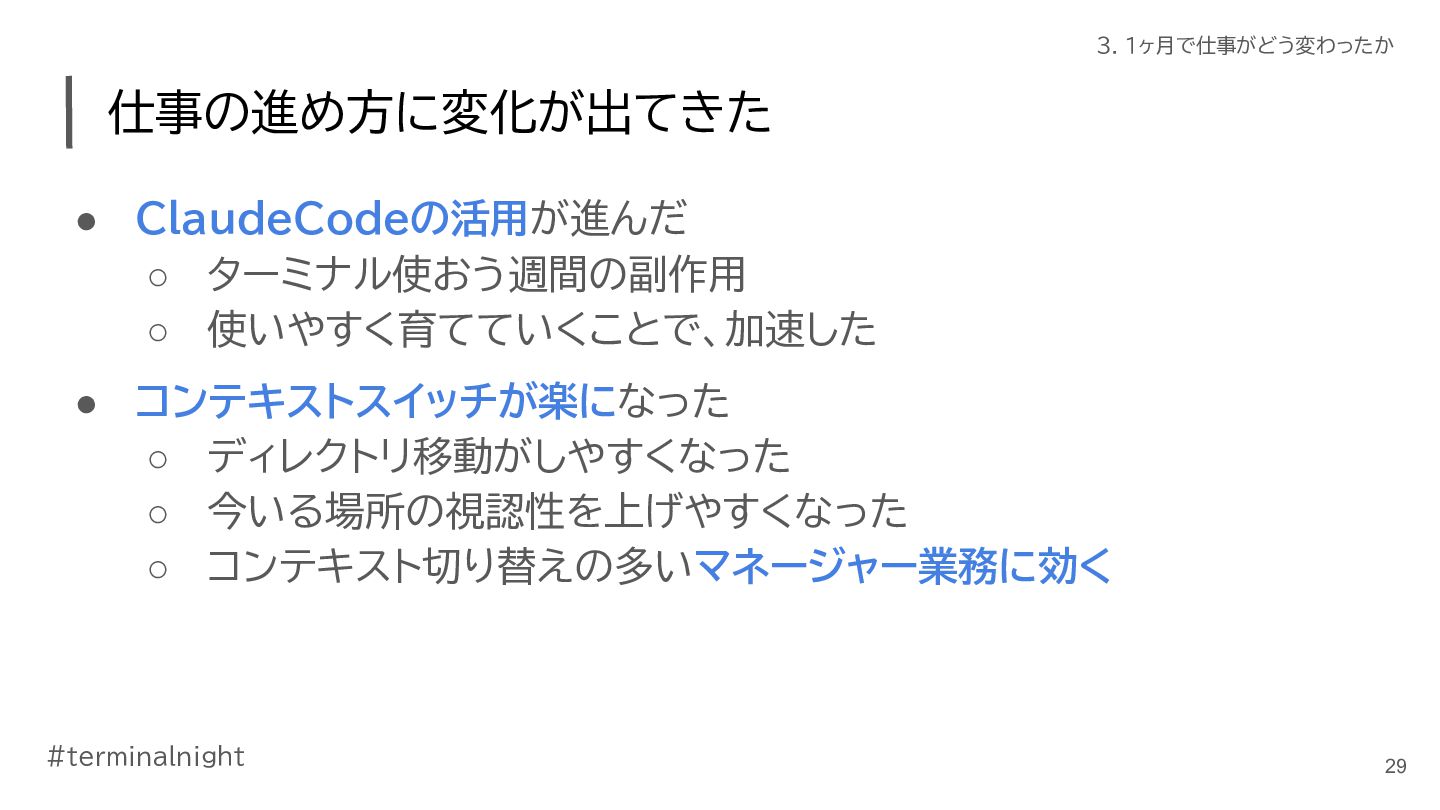 3. #terminalnight 3. 1ヶ月で仕事がどう変わったか 仕事の進め方に変化が出てきた • ClaudeCodeの活用が進んだ ◦ ターミナル使おう週間の副作用 ◦ 使いやすく育てていくことで、加速した
