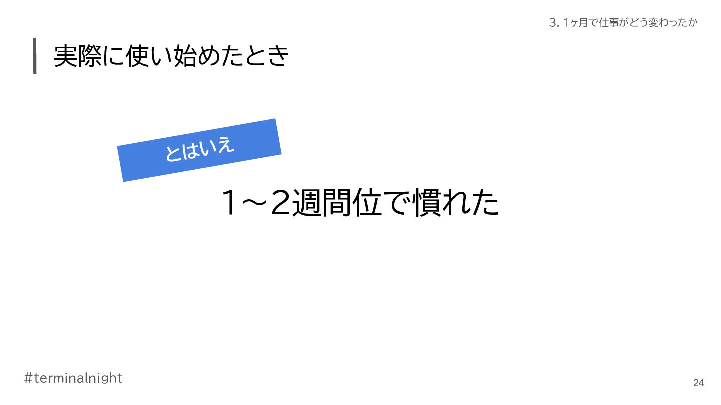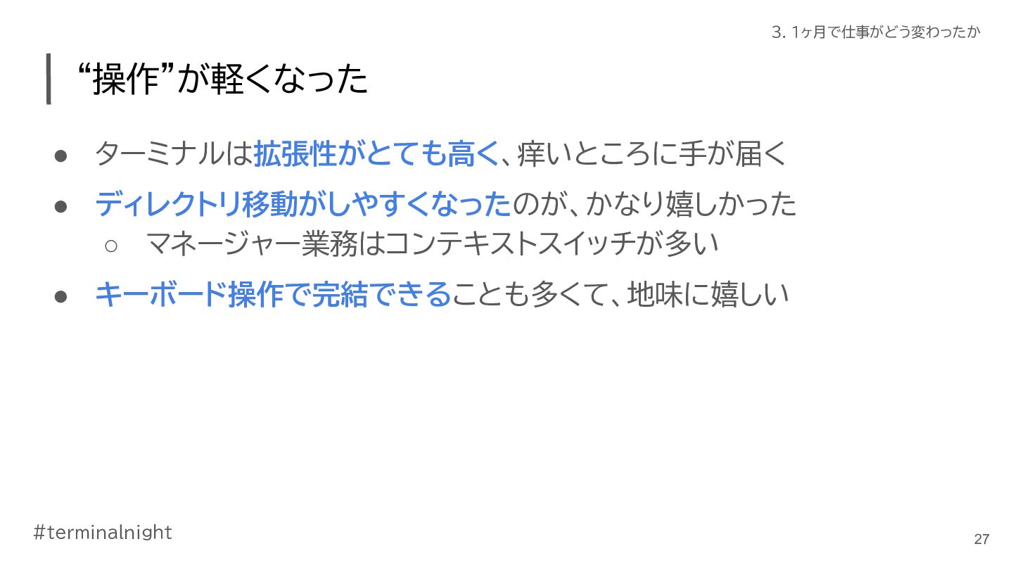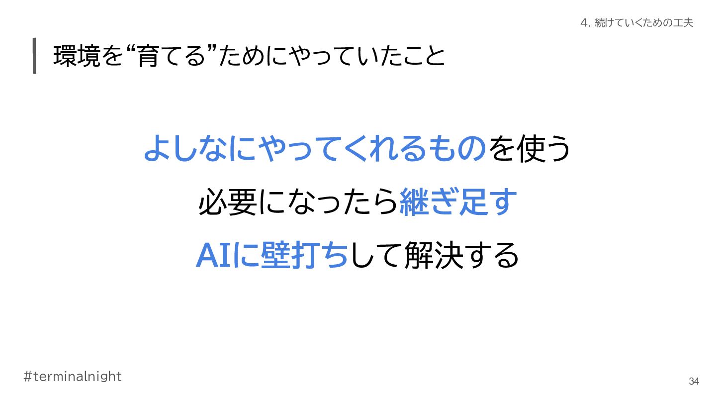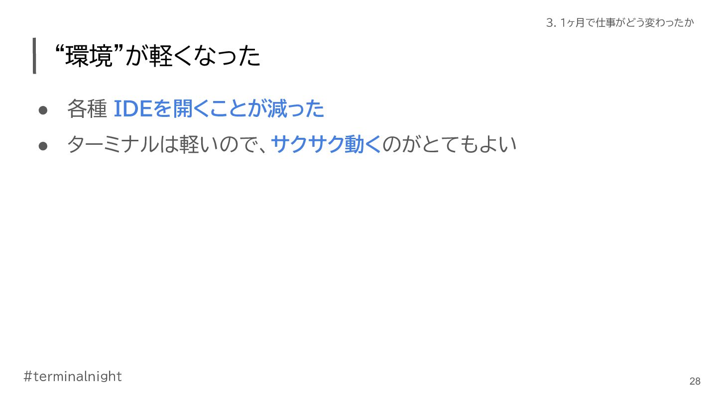 3. #terminalnight 3. 1ヶ月で仕事がどう変わったか 仕事の進め方に変化が出てきた • ClaudeCodeの活用が進んだ ◦ ターミナル使おう週間の副作用 ◦ 使いやすく育てていくことで、加速した