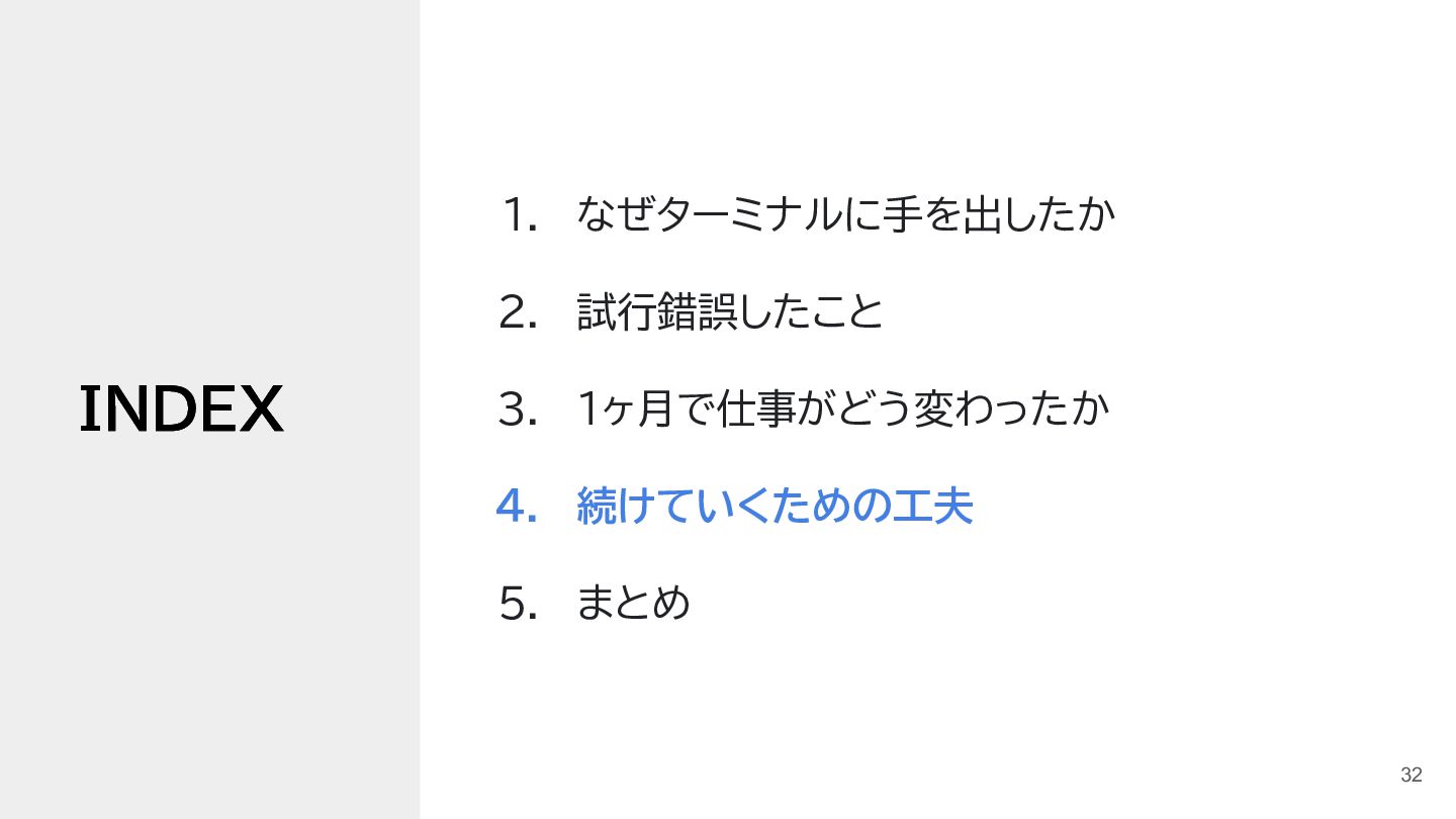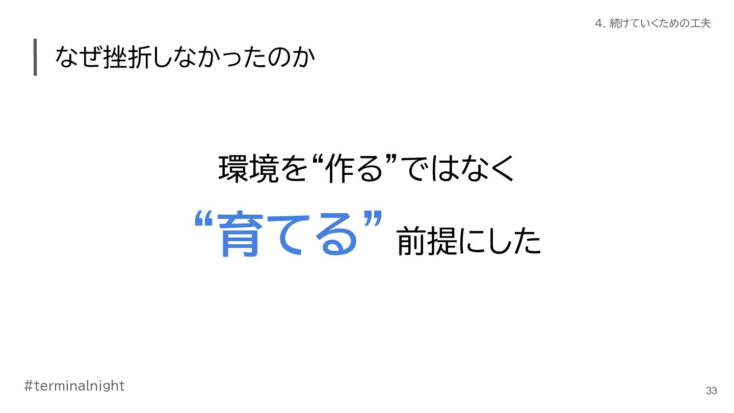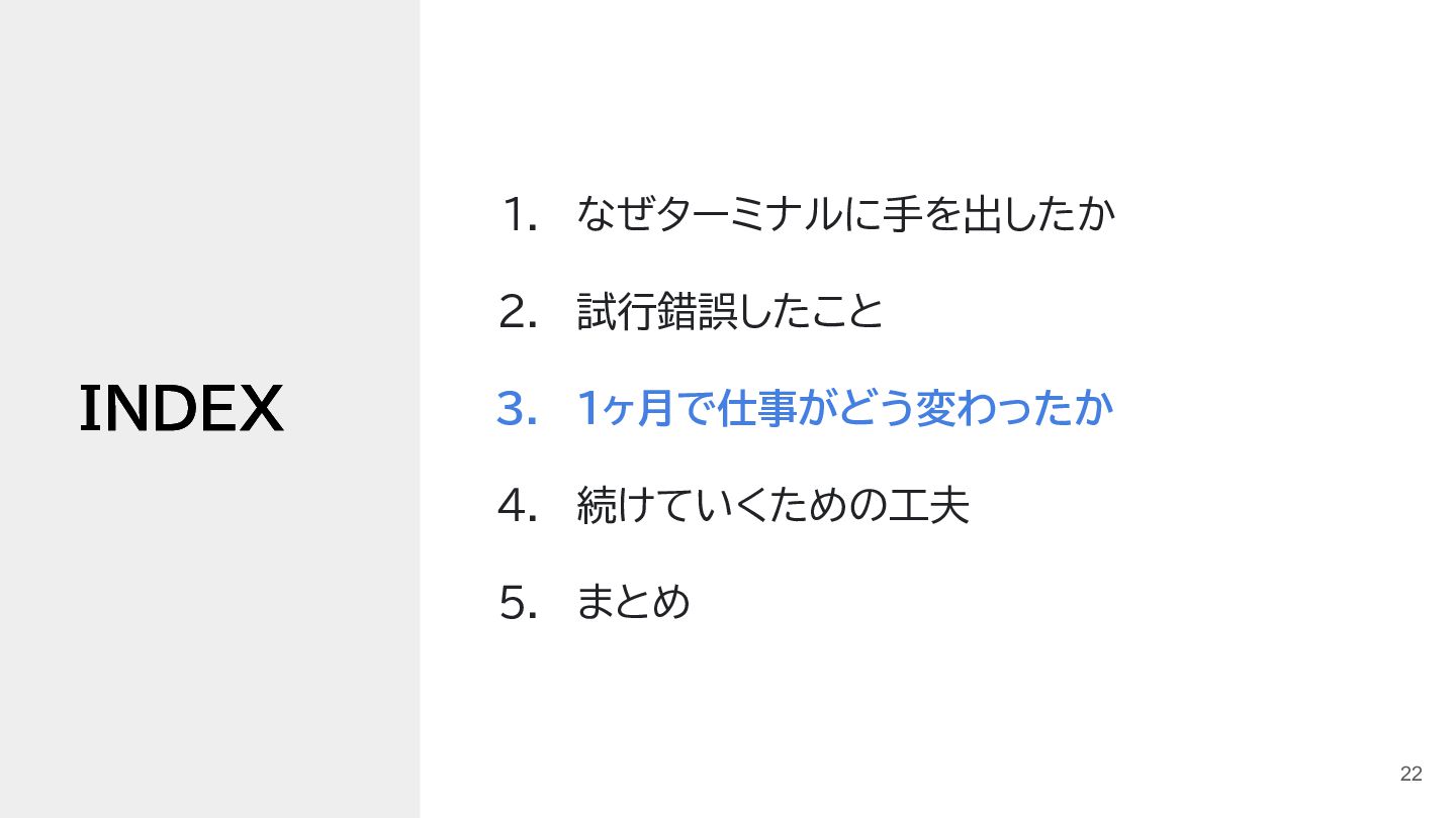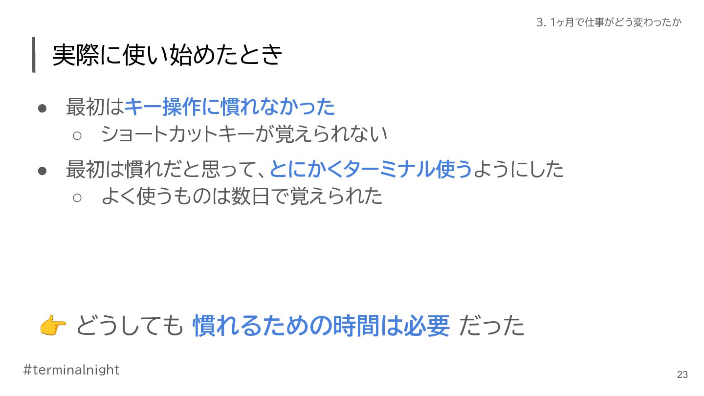 3. #terminalnight 3. 1ヶ月で仕事がどう変わったか 仕事の進め方に変化が出てきた • ClaudeCodeの活用が進んだ ◦ ターミナル使おう週間の副作用 ◦ 使いやすく育てていくことで、加速した