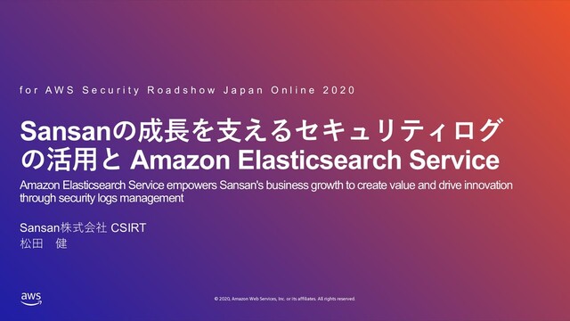 rights reserved. Sansanの成⻑を⽀えるセキュリティログ の活⽤と Amazon Elasticsearch Service f o r A W S S e c u r i t y R o a d s h o w J a p a n O n l i n e 2 0 2 0 Sansan株式会社 CSIRT 松⽥ 健 Amazon Elasticsearch Service empowers Sansan's business growth to create value and drive innovation through security logs management