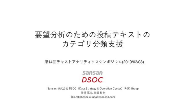 髙橋 寛治, 奥田 裕樹. 要望分析のための投稿テキストのカテゴリ分類支援. 電子情報通信学会 テキストアナリティクス・シンポジウム, 信学技報, Vol.118, No.439, NLC2018-48, pp. 69-74, (2019.2)