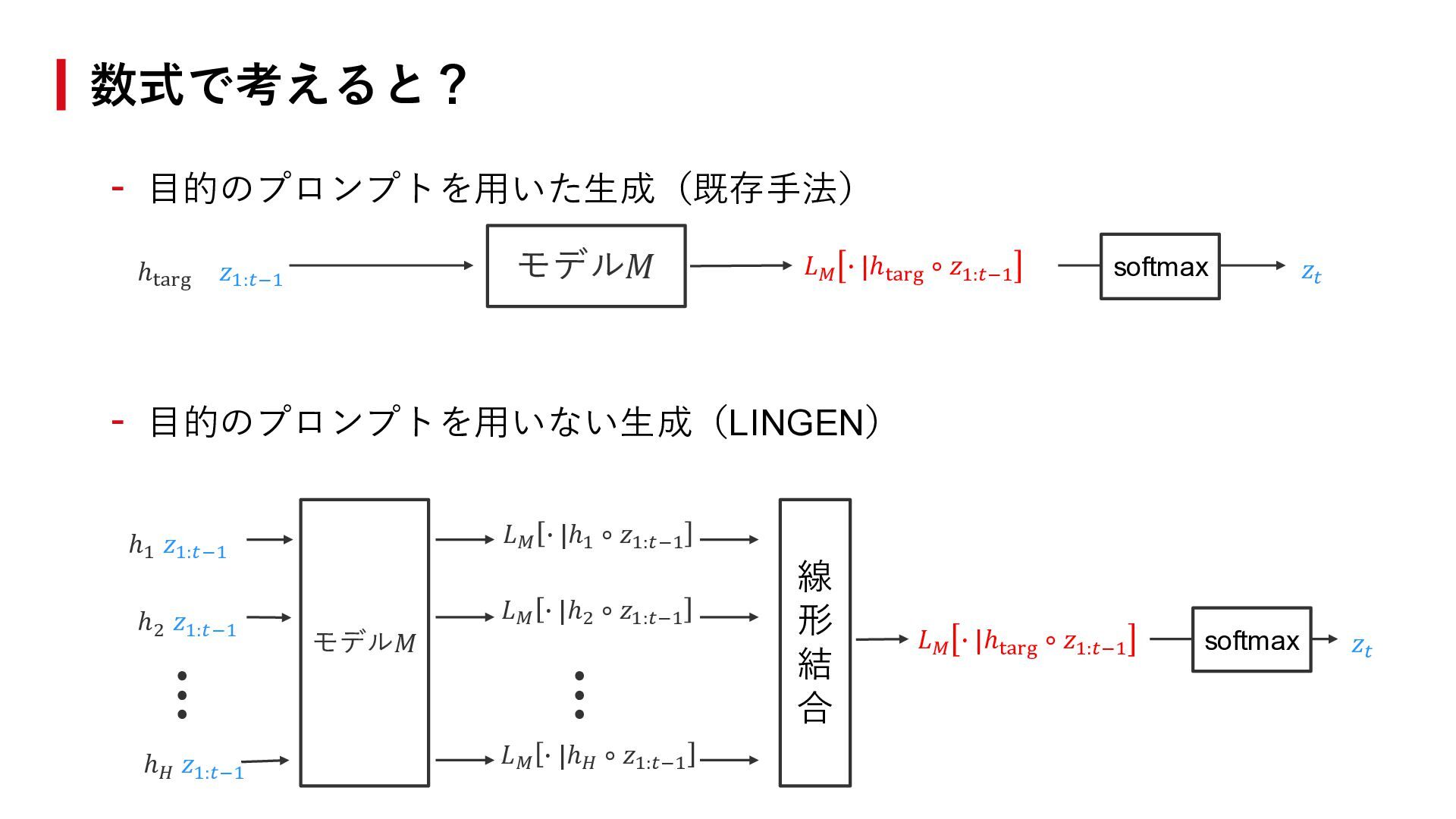 ℎ1 𝑧1:𝑡−1 ℎ2 𝑧1:𝑡−1 ℎ𝐻 𝑧1:𝑡−1 ⋮ 𝐿𝑀 ∙ |ℎ1 ∘ 𝑧1:𝑡−1 𝐿𝑀 ∙ |ℎ2 ∘ 𝑧1:𝑡−1 𝐿𝑀 ∙ |ℎ𝐻 ∘ 𝑧1:𝑡−1 ⋮ 𝐿𝑀 ∙ |ℎtarg ∘ 𝑧1:𝑡−1 softmax 線 形 結 合 𝑧𝑡 𝐿𝑀 ∙ |ℎtarg ∘ 𝑧1:𝑡−1 softmax