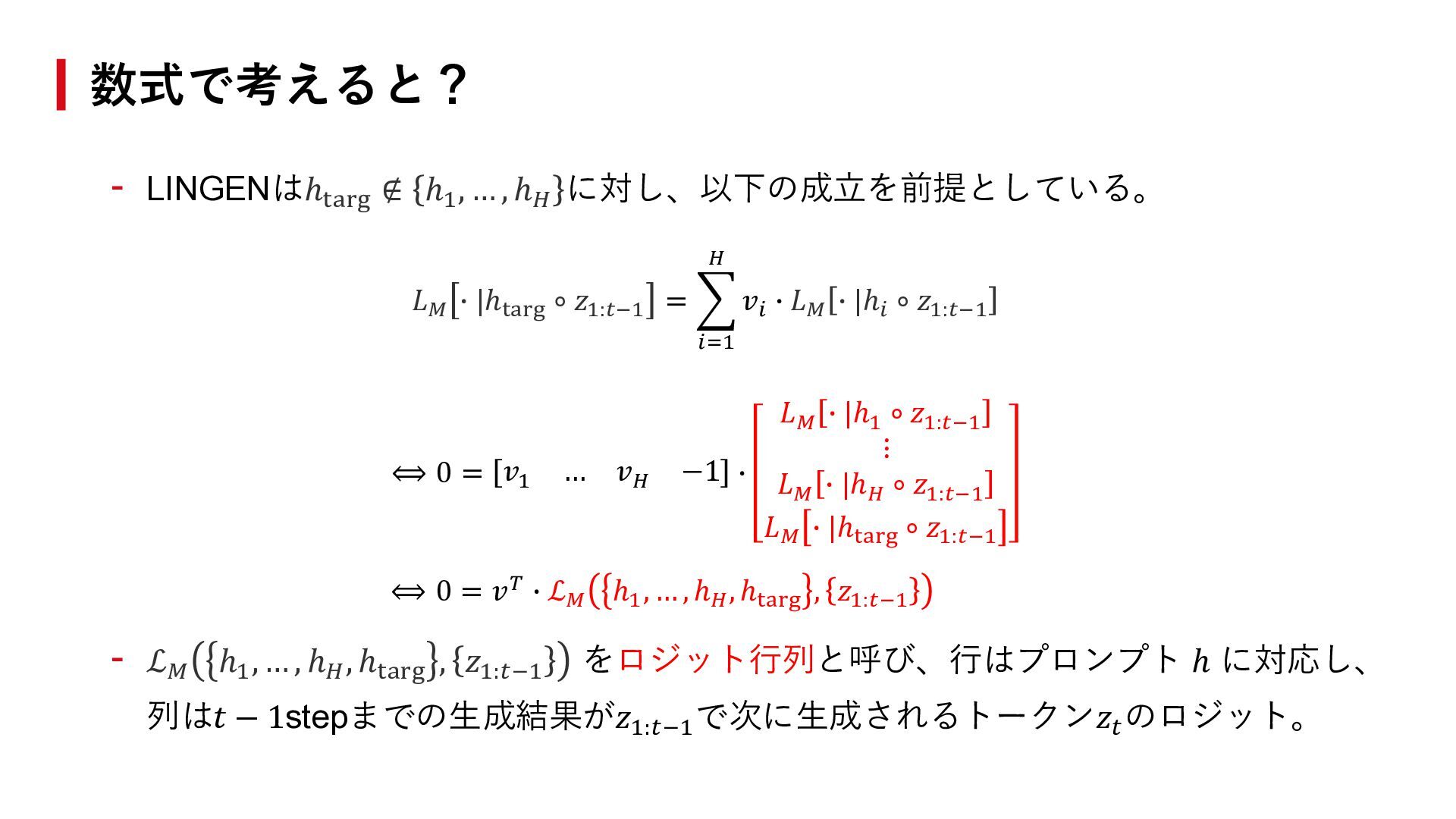 ∙ |ℎtarg ∘ 𝑧1:𝑡−1 = ෍ 𝑖=1 𝐻 𝑣𝑖 ∙ 𝐿𝑀 ∙ |ℎ𝑖 ∘ 𝑧1:𝑡−1 ⟺ 0 = 𝑣1 … 𝑣𝐻 −1 ∙ 𝐿𝑀 ∙ |ℎ1 ∘ 𝑧1:𝑡−1 ⋮ 𝐿𝑀 ∙ |ℎ𝐻 ∘ 𝑧1:𝑡−1 𝐿𝑀 ∙ |ℎtarg ∘ 𝑧1:𝑡−1 ⟺ 0 = 𝑣𝑇 ∙ ℒ𝑀 ℎ1 , … , ℎ𝐻 , ℎtarg , 𝑧1:𝑡−1 - ℒ𝑀 ℎ1 , … , ℎ𝐻 , ℎtarg , 𝑧1:𝑡−1 をロジット行列と呼び、行はプロンプト ℎ に対応し、 列は𝑡 − 1stepまでの生成結果が𝑧1:𝑡−1 で次に生成されるトークン𝑧𝑡 のロジット。 数式で考えると?
