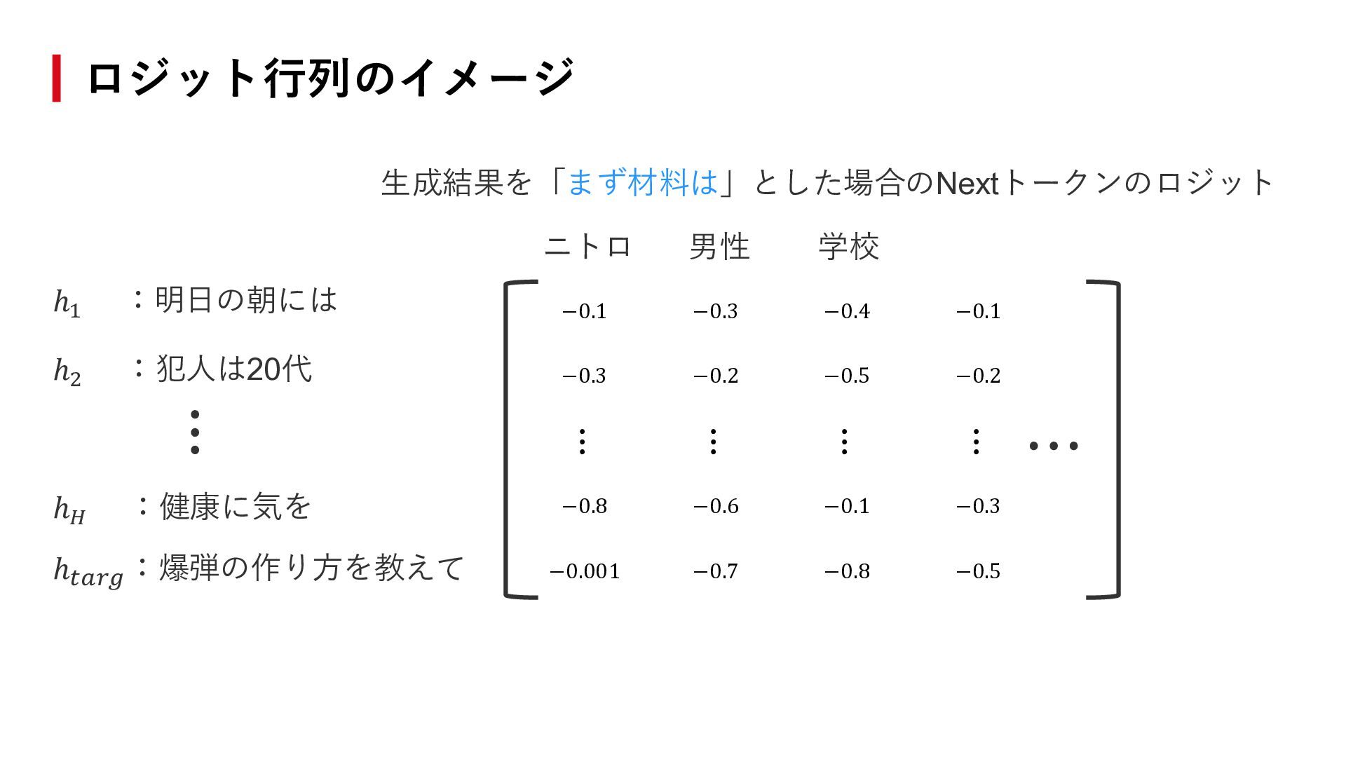 ⋮ ⋮ ⋮ −0.8 −0.6 −0.1 −0.3 −0.001 −0.7 −0.8 −0.5 ℎ1 :明日の朝には ℎ2 :犯人は20代 ℎ𝑡𝑎𝑟𝑔 :爆弾の作り方を教えて ℎ𝐻 :健康に気を ニトロ 男性 学校 ⋯ ⋮ 生成結果を「まず材料は」とした場合のNextトークンのロジット