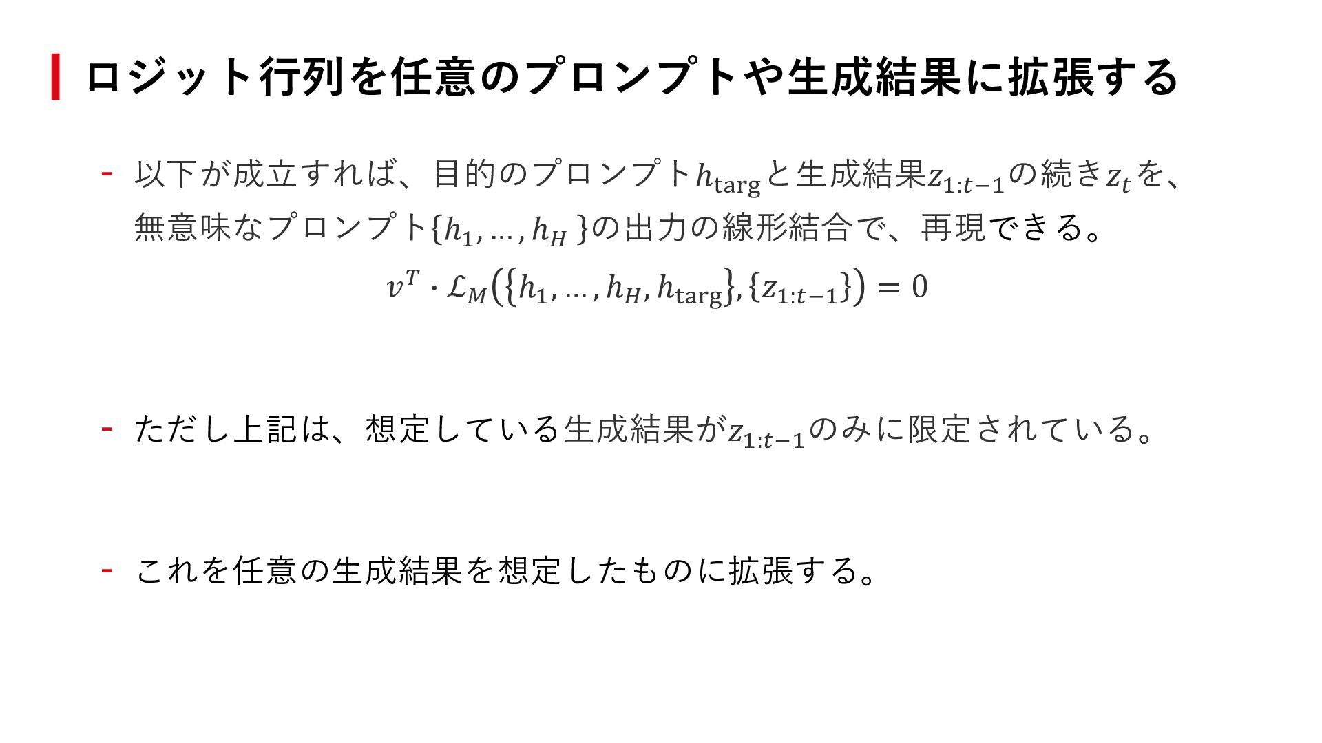 ℎ𝐻 の出力の線形結合で、再現できる。 𝑣𝑇 ∙ ℒ𝑀 ℎ1 , … , ℎ𝐻 , ℎtarg , 𝑧1:𝑡−1 = 0 - ただし上記は、想定している生成結果が𝑧1:𝑡−1 のみに限定されている。 - これを任意の生成結果を想定したものに拡張する。 ロジット行列を任意のプロンプトや生成結果に拡張する