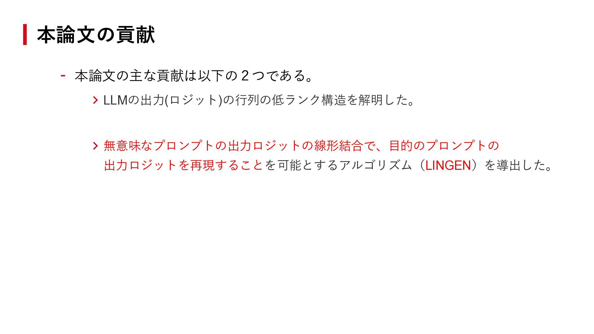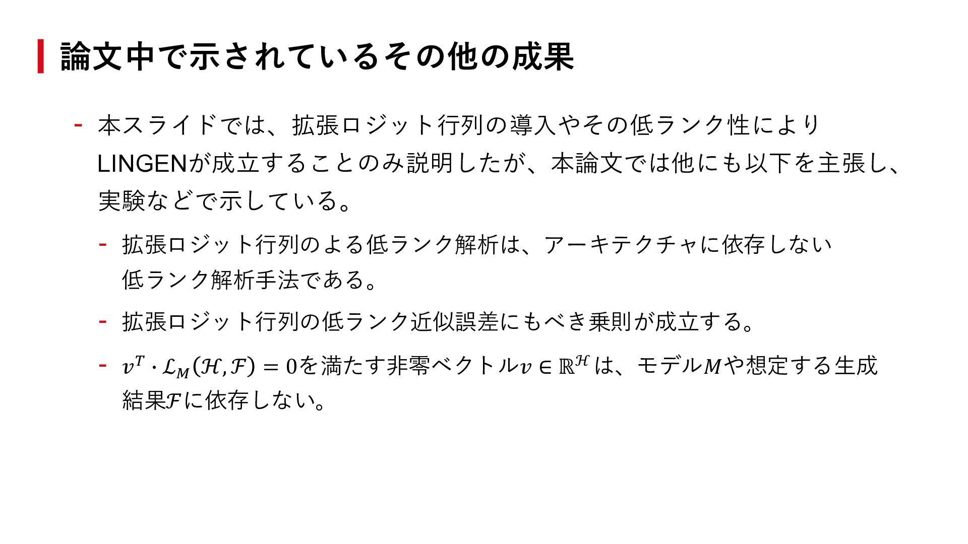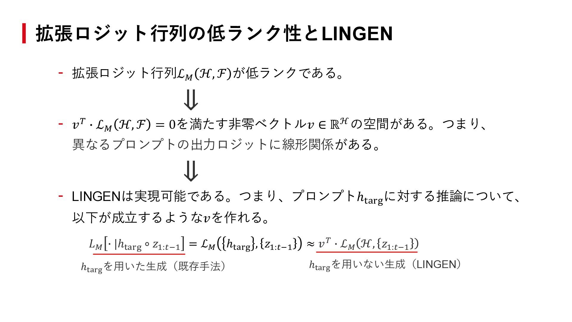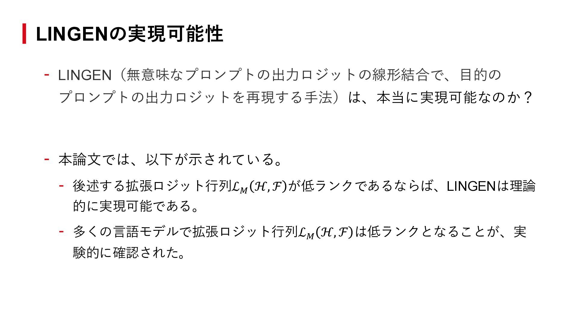 ℱ = 0を満たす非零ベクトル𝑣 ∈ ℝℋの空間がある。つまり、 異なるプロンプトの出力ロジットに線形関係がある。 - LINGENは実現可能である。つまり、プロンプトℎtarg に対する推論について、 以下が成立するような𝑣を作れる。 𝐿𝑀 ∙ |ℎtarg ∘ 𝑧1:𝑡−1 = ℒ𝑀 ℎtarg , 𝑧1:𝑡−1 ≈ 𝑣𝑇 ∙ ℒ𝑀 ℋ, 𝑧1:𝑡−1 拡張ロジット行列の低ランク性とLINGEN ℎtarg を用いた生成(既存手法) ℎtarg を用いない生成(LINGEN) ⇓ ⇓
