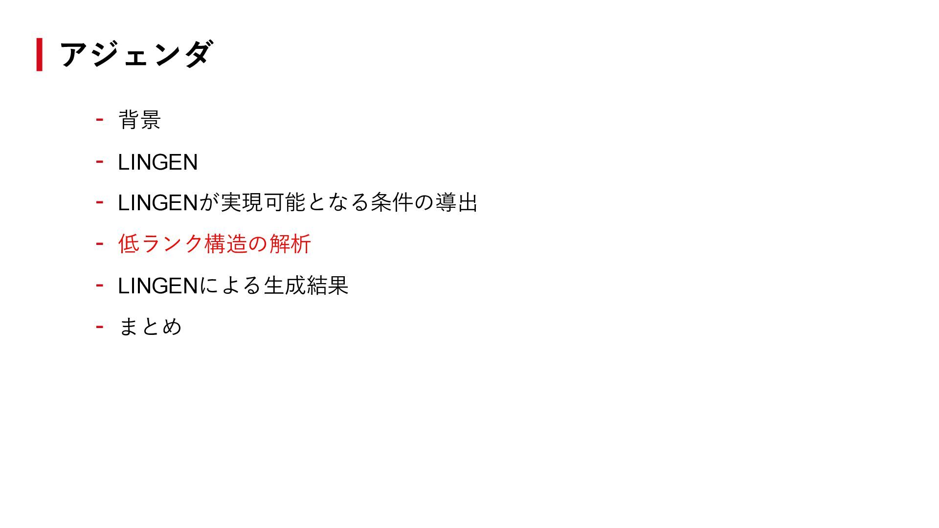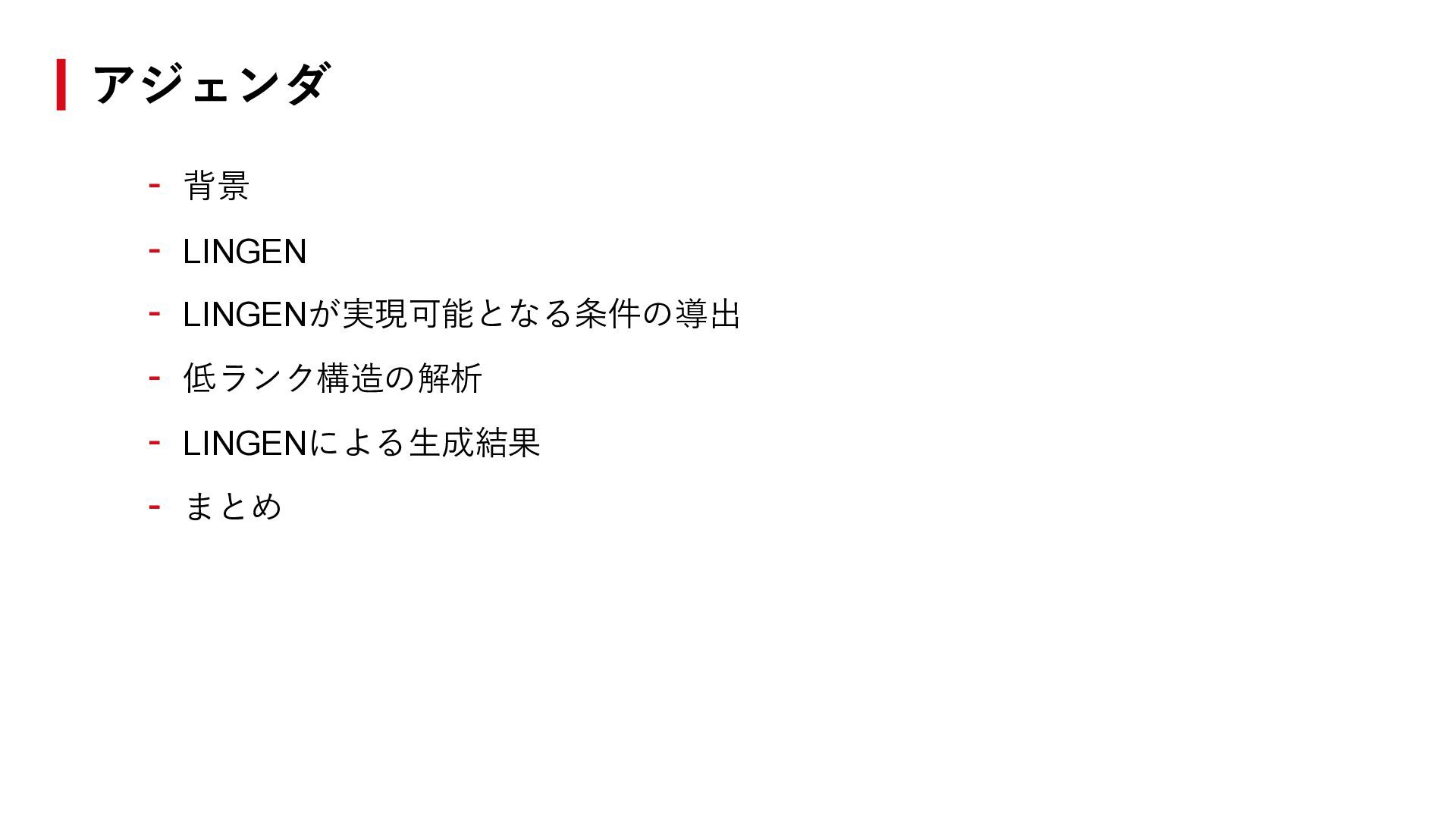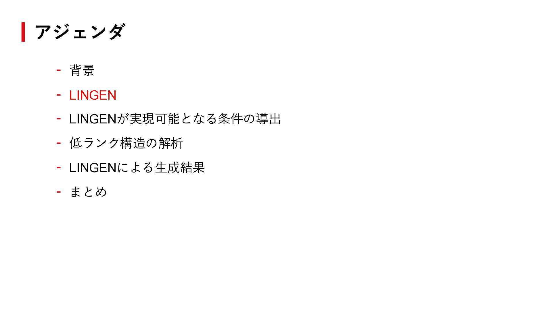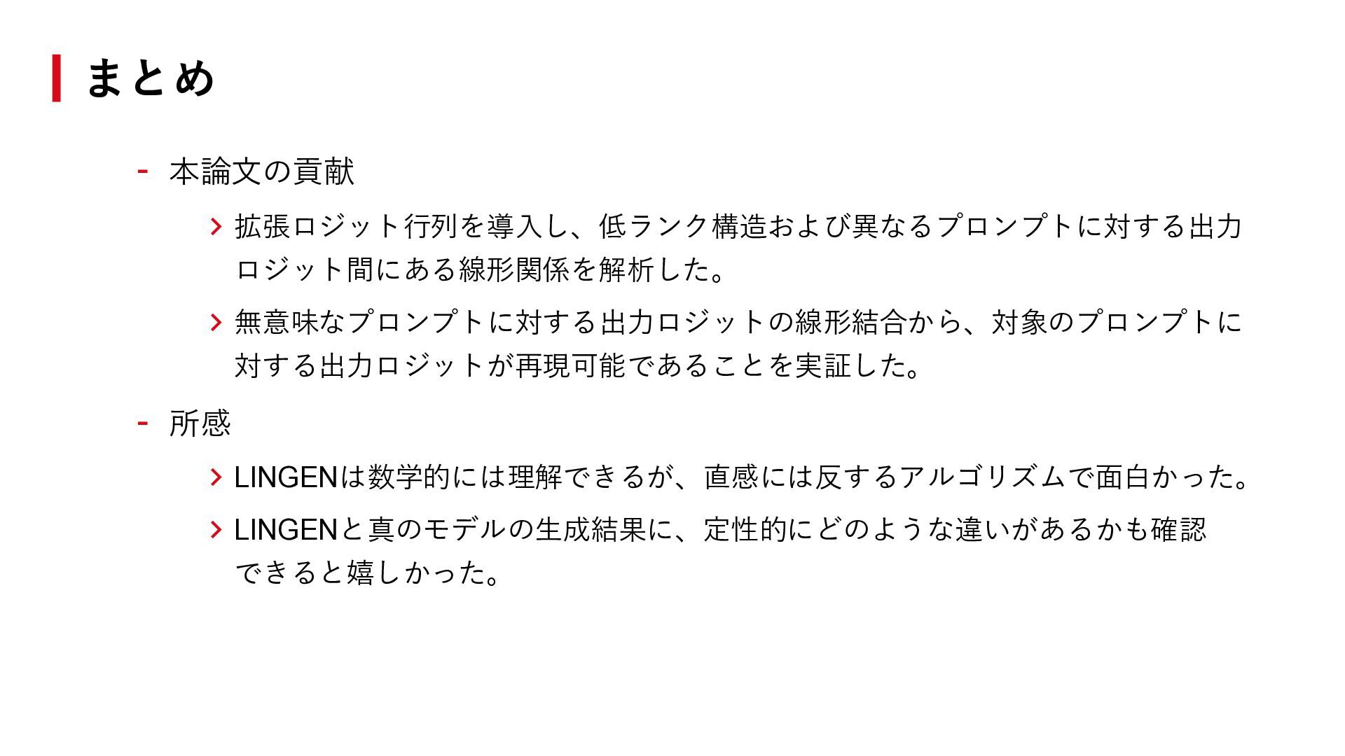 ℱ = 0を満たす非零ベクトル𝑣 ∈ ℝℋの空間がある。つまり、 異なるプロンプトの出力ロジットに線形関係がある。 - LINGENは実現可能である。つまり、プロンプトℎtarg に対する推論について、 以下が成立するような𝑣を作れる。 𝐿𝑀 ∙ |ℎtarg ∘ 𝑧1:𝑡−1 = ℒ𝑀 ℎtarg , 𝑧1:𝑡−1 ≈ 𝑣𝑇 ∙ ℒ𝑀 ℋ, 𝑧1:𝑡−1 拡張ロジット行列の低ランク性とLINGEN ℎtarg を用いた生成(既存手法) ℎtarg を用いない生成(LINGEN) ⇓ ⇓