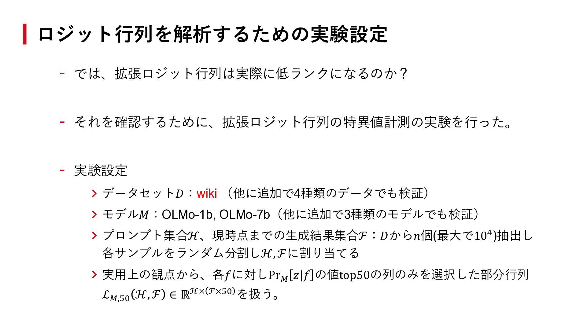 モデル𝑀:OLMo-1b, OLMo-7b(他に追加で3種類のモデルでも検証) > プロンプト集合ℋ、現時点までの生成結果集合ℱ:𝐷から𝑛個(最大で104)抽出し 各サンプルをランダム分割しℋ, ℱに割り当てる > 実用上の観点から、各𝑓に対しPr𝑀 𝑧|𝑓 の値top50の列のみを選択した部分行列 ℒ𝑀,50 ℋ, ℱ ∈ ℝℋ× ℱ×50 を扱う。 ロジット行列を解析するための実験設定