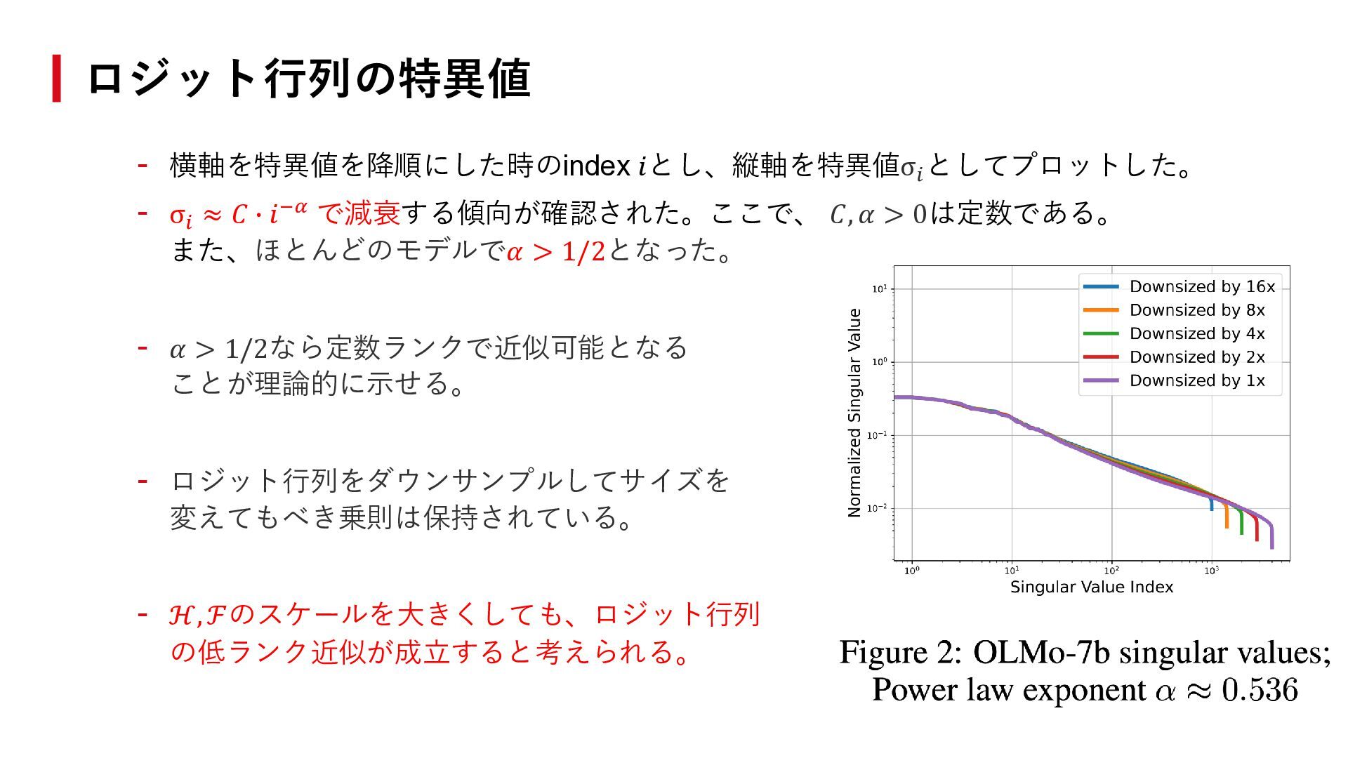 で減衰する傾向が確認された。ここで、 𝐶, 𝛼 > 0は定数である。 また、ほとんどのモデルで𝛼 > 1/2となった。 - 𝛼 > 1/2なら定数ランクで近似可能となる ことが理論的に示せる。 - ロジット行列をダウンサンプルしてサイズを 変えてもべき乗則は保持されている。 - ℋ, ℱのスケールを大きくしても、ロジット行列 の低ランク近似が成立すると考えられる。 ロジット行列の特異値