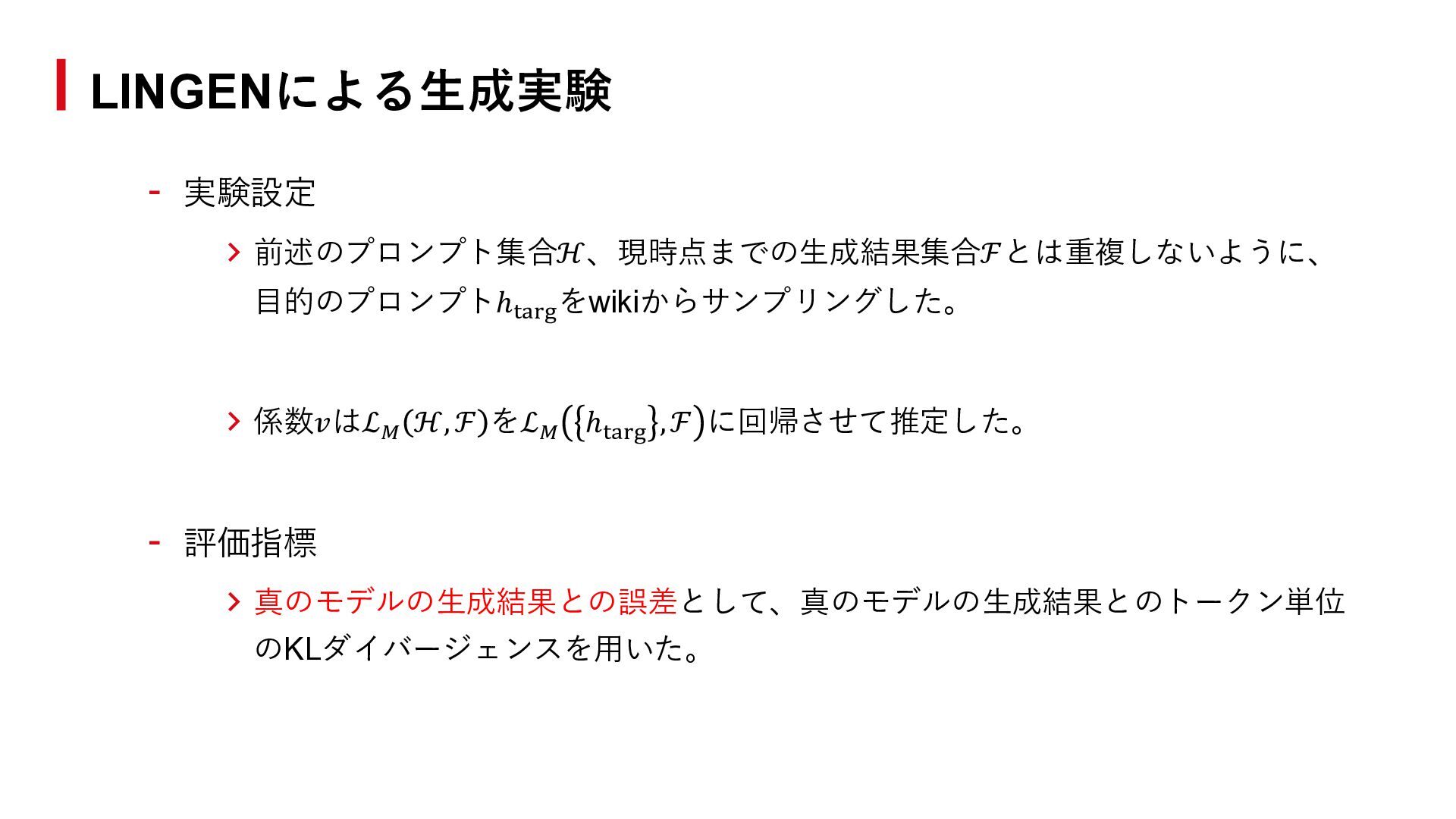 をℒ𝑀 ℎtarg , ℱ に回帰させて推定した。 - 評価指標 > 真のモデルの生成結果との誤差として、真のモデルの生成結果とのトークン単位 のKLダイバージェンスを用いた。 LINGENによる生成実験