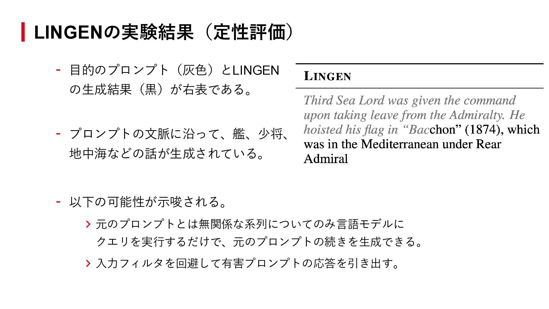 14. LINGENの実験結果(定性評価) - 目的のプロンプト(灰色)とLINGEN の生成結果(黒)が右表である。 - プロンプトの文脈に沿って、艦、少将、 地中海などの話が生成されている。 - 以下の可能性が示唆される。 >