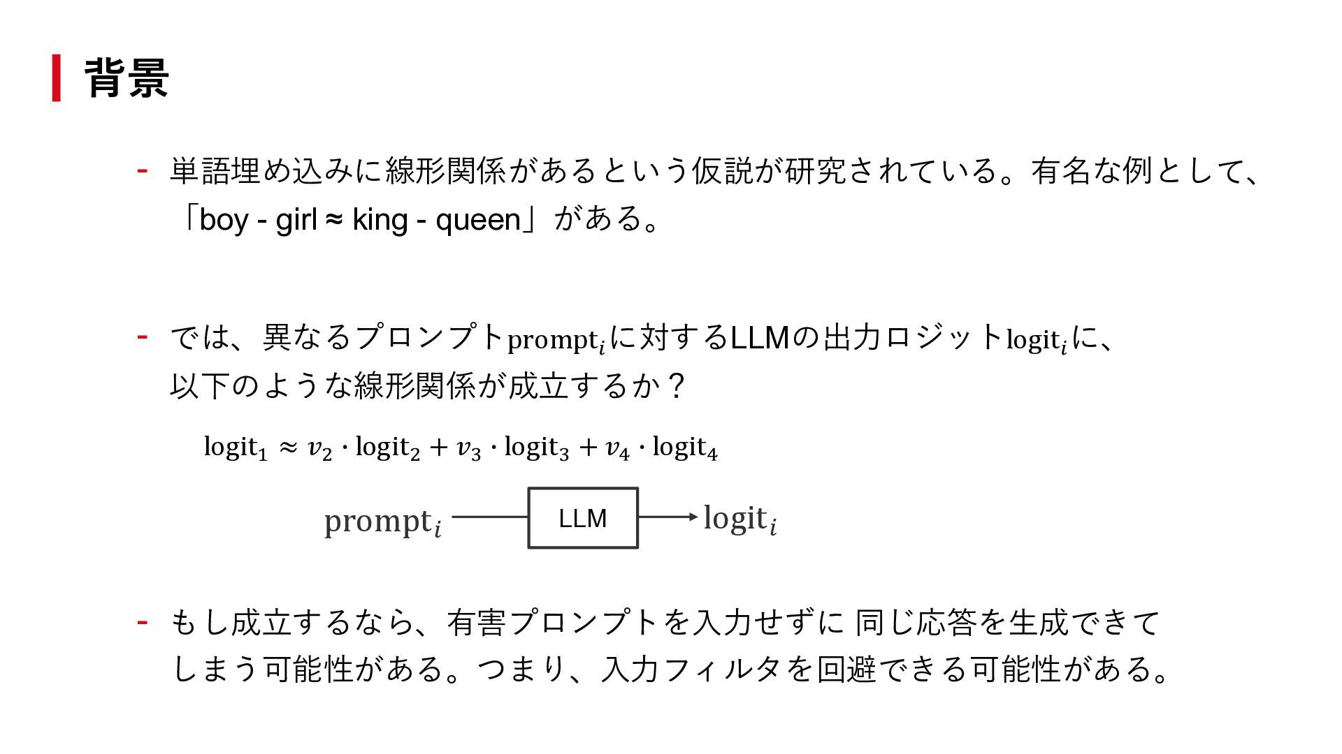 では、異なるプロンプトprompt𝑖 に対するLLMの出力ロジットlogit𝑖 に、 以下のような線形関係が成立するか? logit1 ≈ 𝑣2 ∙ logit2 + 𝑣3 ∙ logit3 + 𝑣4 ∙ logit4 - もし成立するなら、有害プロンプトを入力せずに 同じ応答を生成できて しまう可能性がある。つまり、入力フィルタを回避できる可能性がある。 背景 LLM logit𝑖 prompt𝑖