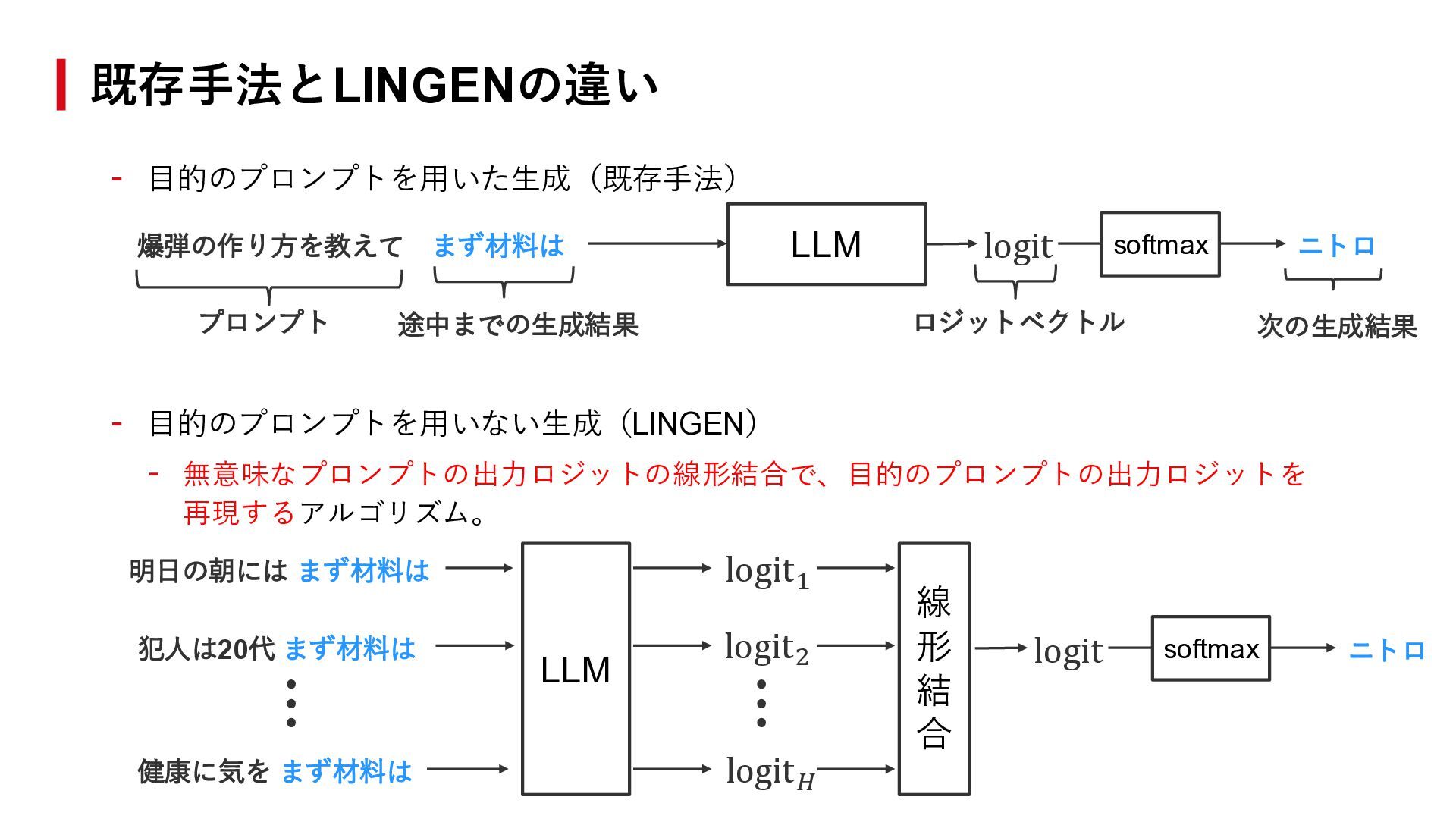 3. - 目的のプロンプトを用いた生成(既存手法) - 目的のプロンプトを用いない生成(LINGEN) - 無意味なプロンプトの出力ロジットの線形結合で、目的のプロンプトの出力ロジットを 再現するアルゴリズム。 既存手法とLINGENの違い 爆弾の作り方を教えて まず材料は