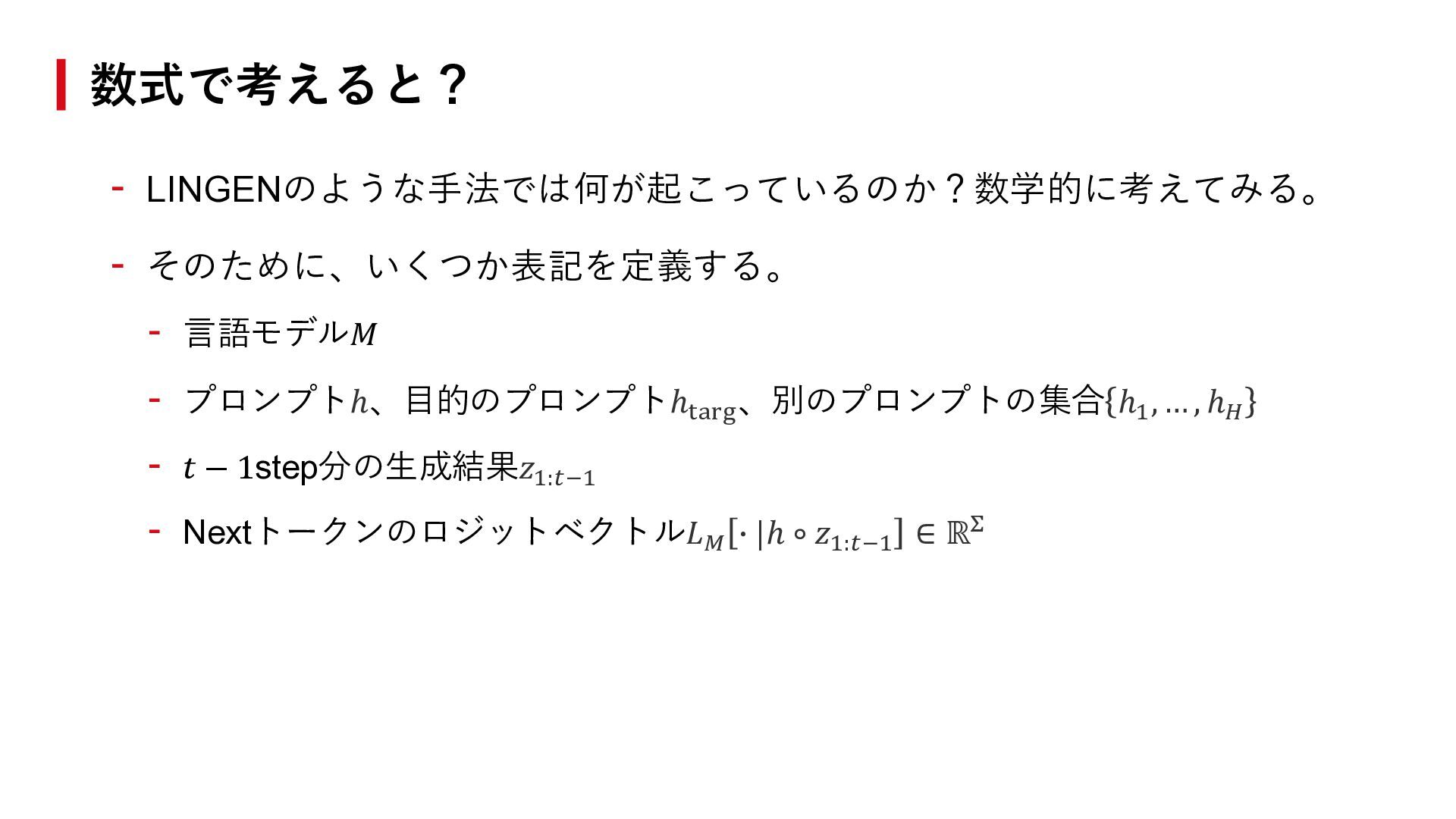 4. - LINGENのような手法では何が起こっているのか?数学的に考えてみる。 - そのために、いくつか表記を定義する。 - 言語モデル𝑀 - プロンプトℎ、目的のプロンプトℎtarg 、別のプロンプトの集合 ℎ1